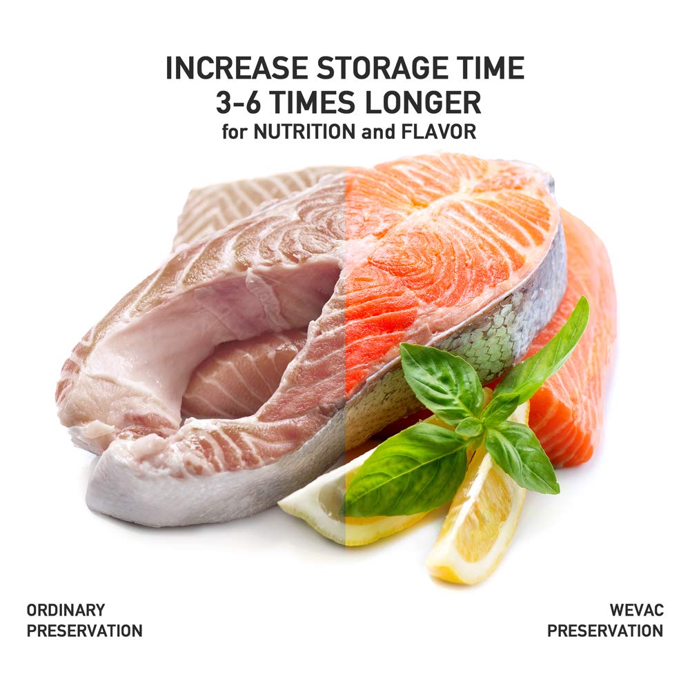 Q: How does vacuum sealing with Wevac help preserve food?A: Vacuum sealing with Wevac can extend the shelf life of your food by 3-6 times, locking in freshness, flavor, and nutrition while preventing freezer burn and dehydration.
