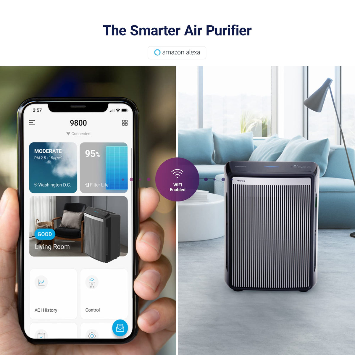 Q: Can I control the Winix 9800 air purifier remotely?A: Yes, the Winix 9800 features WiFi connectivity that allows you to monitor and control the air purifier from anywhere using the Winix Smart App.