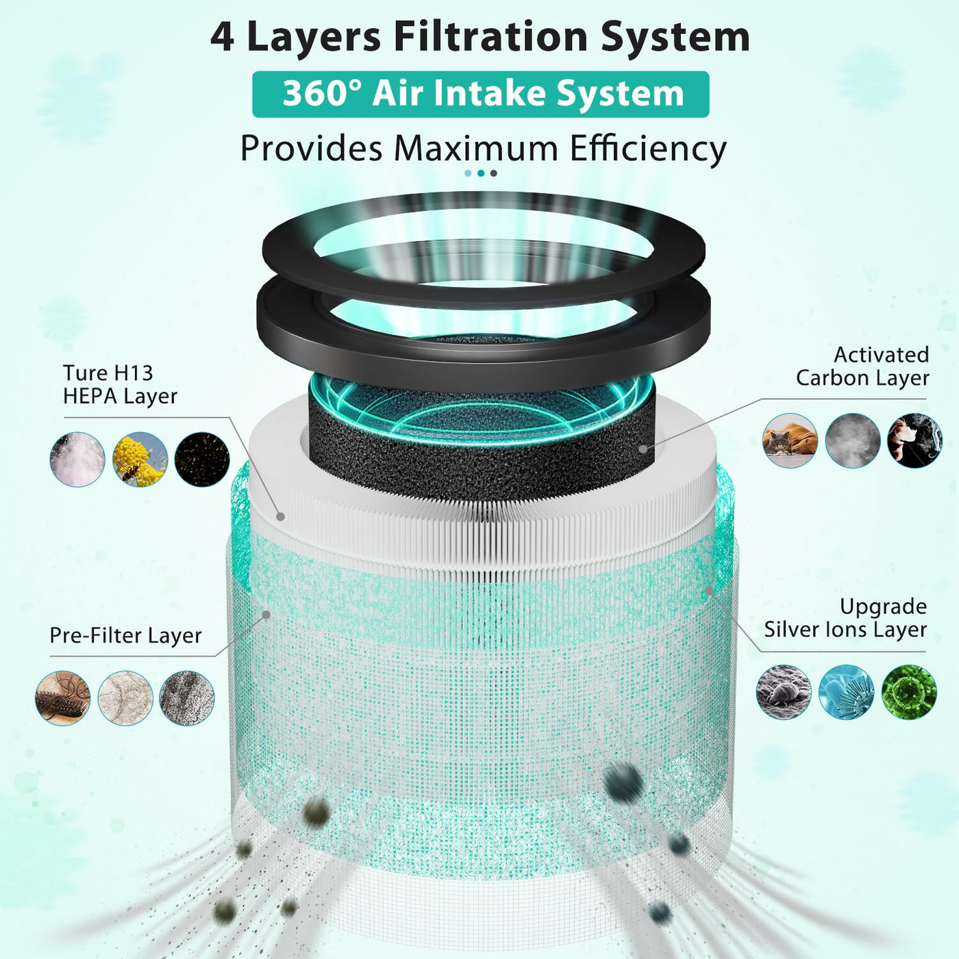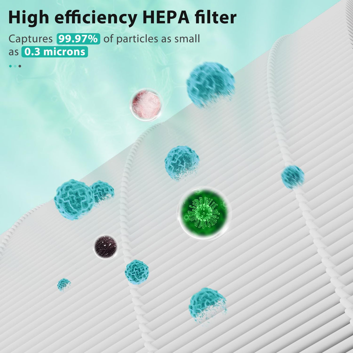Q: What is the filtration efficiency of the MK06 MK01 True HEPA filter?A: The MK06 MK01 True HEPA filter captures 99.97% of airborne particles as small as 0.3 microns, including household dust, pet dander, and smoke particles, ensuring high-quality air purification.