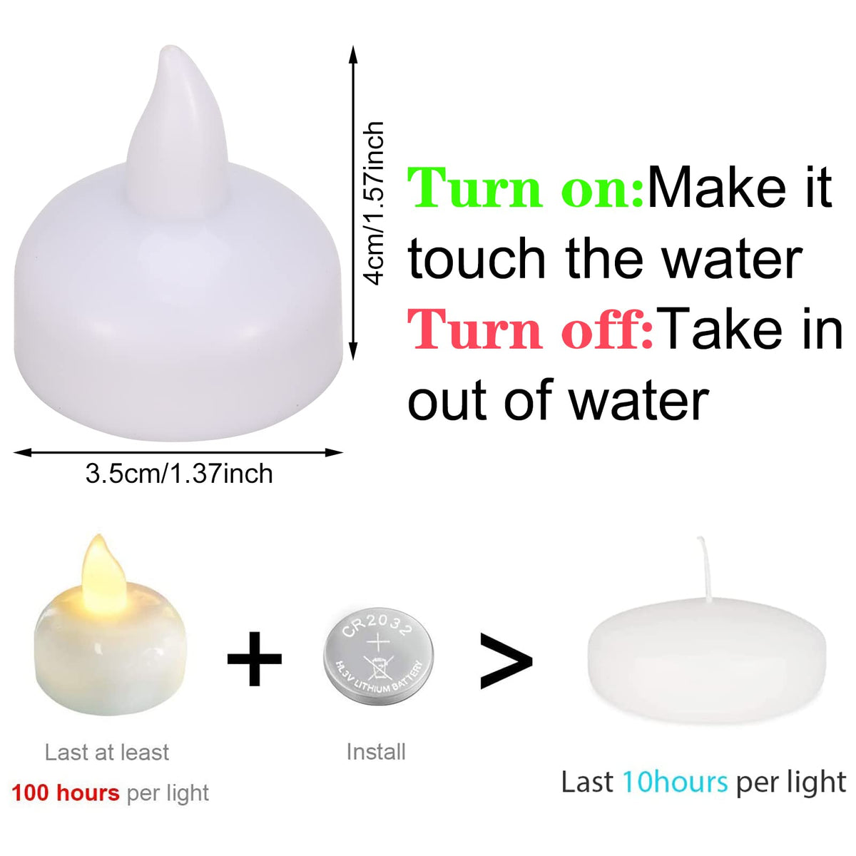 Fantastic Waterproof: These Floating Tealights (D1.5'' X H1.6'') Are Completely Waterproof. Put These Led Tealight Candles In Your Pool And Vase Or Bowls Filled With Water To Create A Warm And Romantic Ambiance. The Package Includes 12 X Floating Tealights (Batteries Installed) | Energy Saving And Convenient Operation: Each Waterproof Flameless Tea Lights Will Come With Pre-Installed Battery For Your Quick And Convenient Use; Water-Activated, Fun Floating Candles That Work Through The Conduction Of The Water; Simply Put It In/Out Water To Control It; Note: Please Make Sure That The Bottoms Are All Tightened Before Use | Safe For Kids, Pets, Seniors : These Battery Tea Lights Can Be Used Without Having To Worry Of Flame, Absolutely No Fire Hazards Or Burning Risks, Safe For Families With Pets Or Young Children | Warm Romantic: These Flameless Led Tea Light Candles Can Create Warm And Romantic Atmosphere And Canbe Widely Used To Decorate Home, Bars, Hotel, Parties, Birthday, Holidays, Wedding, ,Valentine'S,Halloween, Bedroom,Tabletop,Or Other Occasions | Long Battery Life: Each Led Flameless Floating Candles Use A Cr2032 Button Cell Which Is Very Efficient And Easy To Buy Online Or From Local Store. Last About 100 Hours With A New Battery. Batteries Included