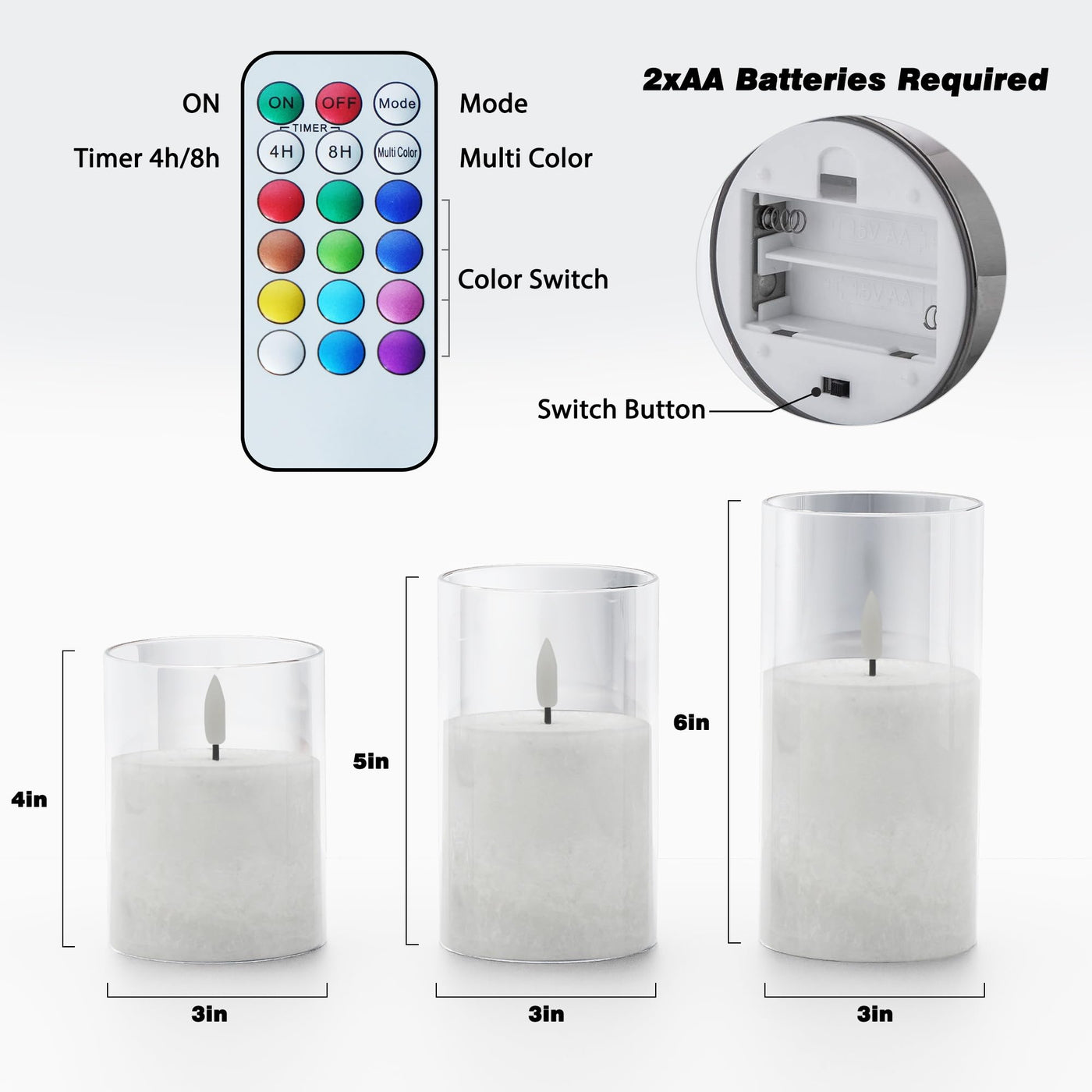 These Are Crystal Textured Battery Powered Candles, With Remote Control And Timer, Unique In Appearance. A Set Of Three, The Sizes Are 3*4/3*5/3*6 Inches. This Set Of Flameless Votive Candles Is Filled With Real Wax In A Translucent Glass. The Light Source Is The 3D Candle Wick, Which Can Be Adjusted To Different Brightness And Colors. It Has Two Modes: Flickering And Constant Light And Looks Just Like Real Candles. But There Is No Danger Of Real Flames, So It Is Very Safe To Use. Powered By Two Aa Batteries (Not Included), The Battery Life Depends On The Frequency Of Use, At Least Half A Month. Ideal For Use In Various Decorative Scenarios, Such As Housewarming Gifts, Wedding & Home & Room & Dining Table & Coffee Table Decorations, Birthday Parties, And Holiday Decorations Such As Christmas, Halloween, Etc.