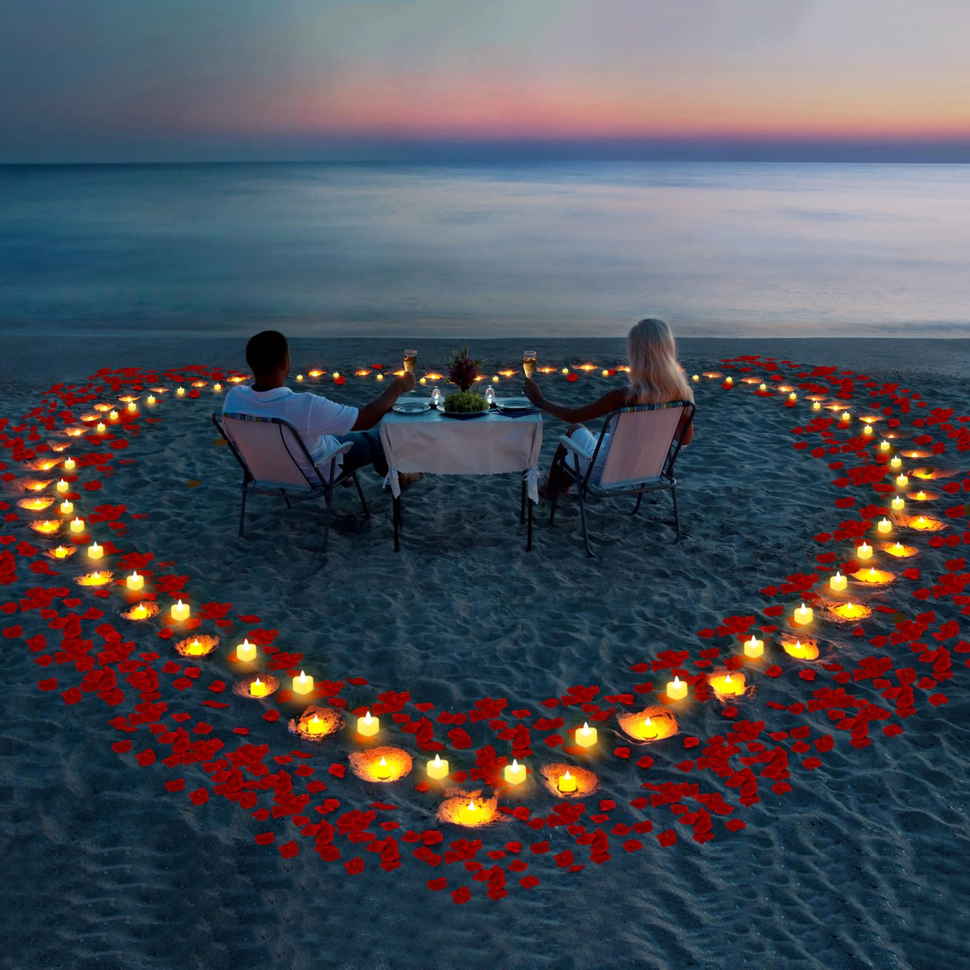 Q: What is the size of the flameless candles and rose petals?A: The flameless candles measure approximately 1.57 inches by 1.77 inches, while each artificial rose petal is about 2 inches by 2 inches, closely resembling real flower sizes.