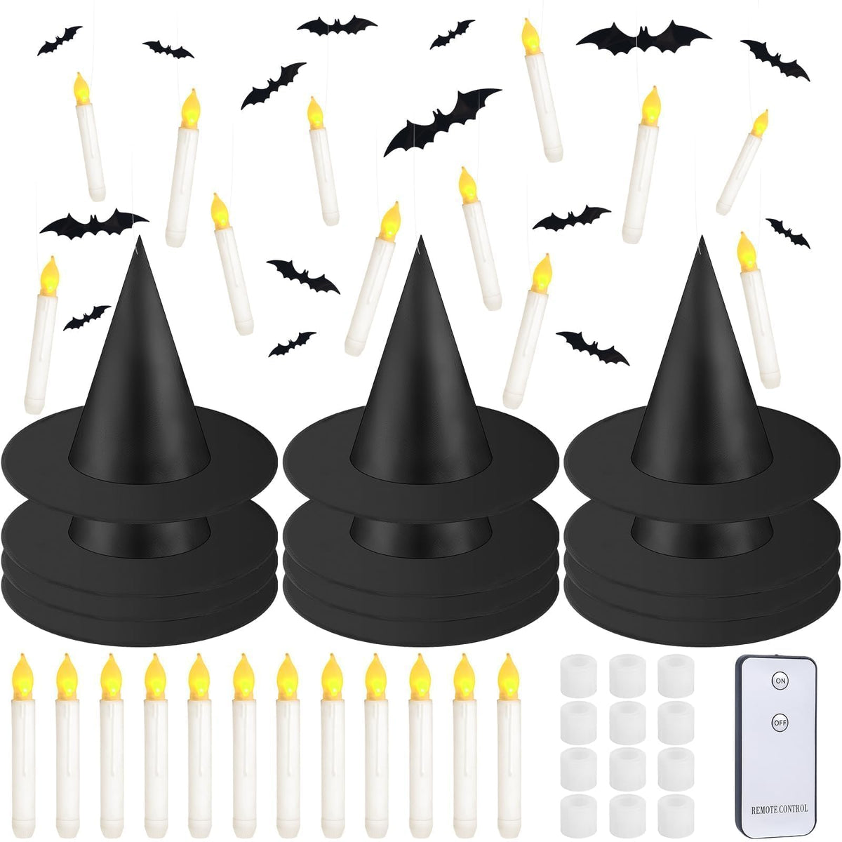 80 Pcs Halloween Hanging Witch Hats And Taper Floating Candles Set Includes 12 Witch Hats 12 Led Floating Candles Lights 56 3D B