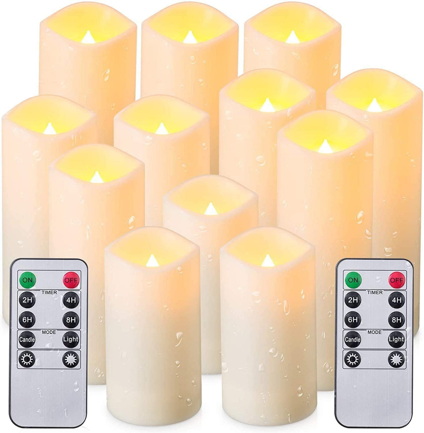 Q: How does the remote control work with these candles?A: The included remote control features a 10-key timer that allows you to set the candles to automatically turn on and off at the same time each day for either 2, 4, 6, or 8 hours.