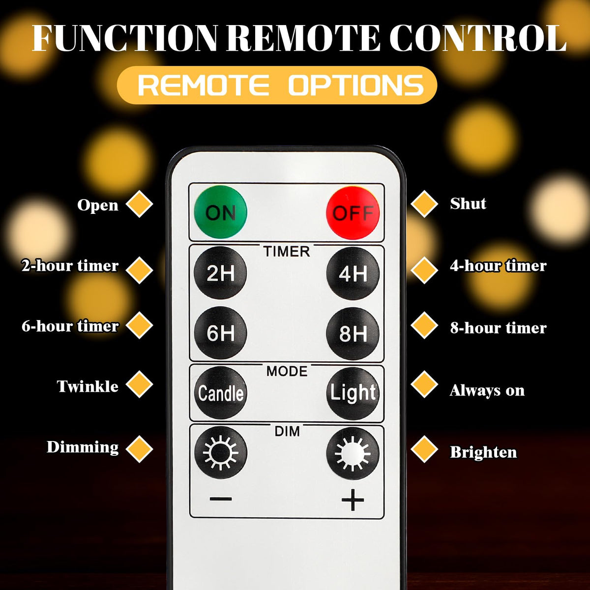 Q: How do I operate the remote control for the candles?A: The candles come with a convenient 10-key remote control that allows you to turn the candles on and off, adjust brightness levels, control the flicker effect, and set a timer for 2, 4, 6, or 8 hours.