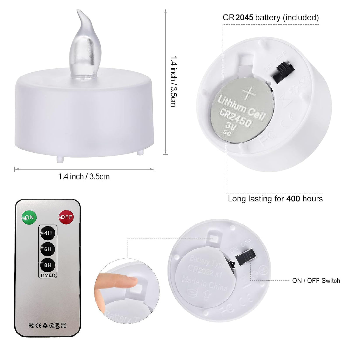 Q: How long do the battery-operated tea lights last?A: The battery-operated tea lights are powered by a large capacity CR2450 button battery, allowing them to last for over 400 hours of continuous use.