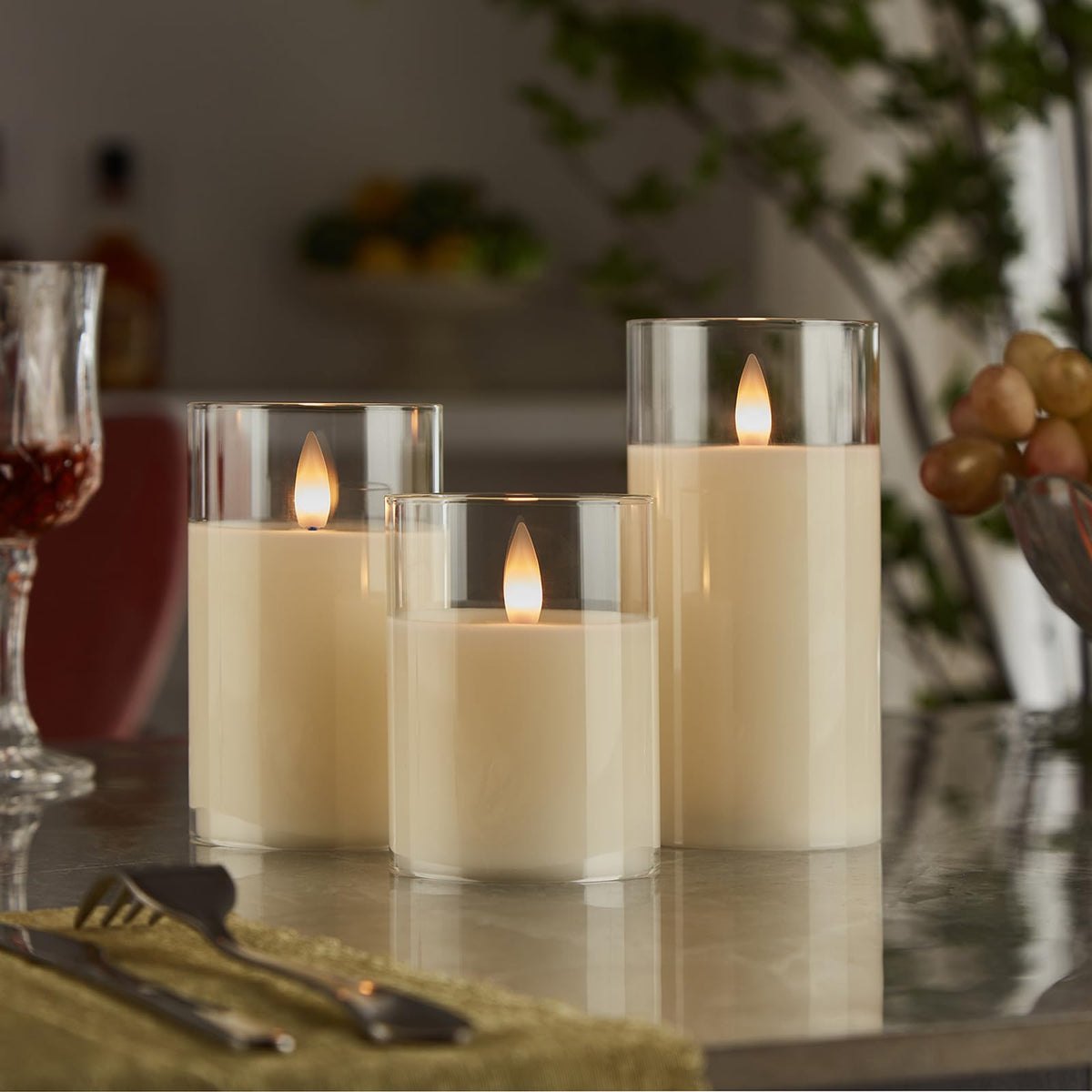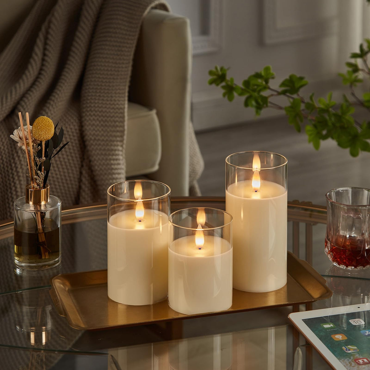Q: What is the size of the CozierGlow flameless candle set?A: The set includes three flameless pillar candles with diameters of 3 inches and heights of 4, 5, and 6 inches, making them suitable for various home decor styles.