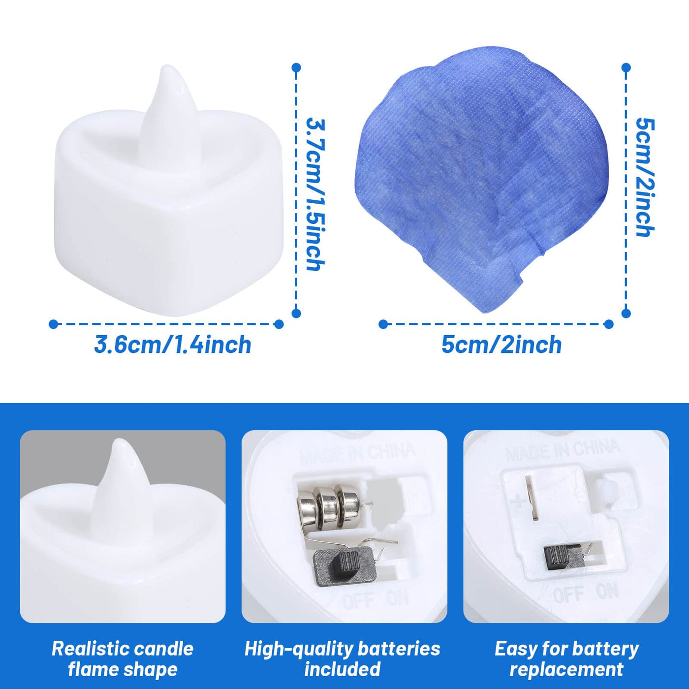 Package Include: 24 X Flameless Led Candles(Blue), 2000 X Artifical Rose Petals(Blue) Product Specification: Led Candles: Material: Led+Pp Light Color: Blue Battery Type: Lr41 Button Cell (Included) Product Size: 1.5 Inches (Diameter) ? 1.6 Inches (Height) Rose Petals: Material: Silk Color: Blue Product Size: 5 Cm X 5 Cm