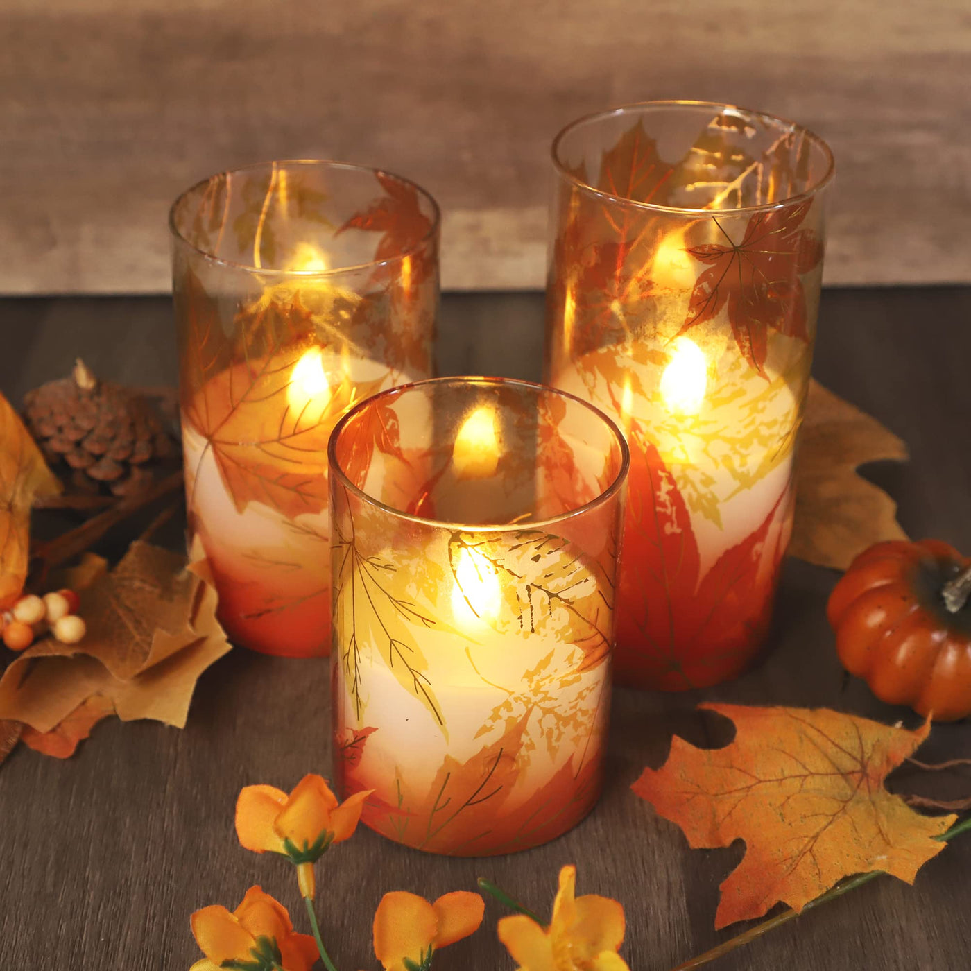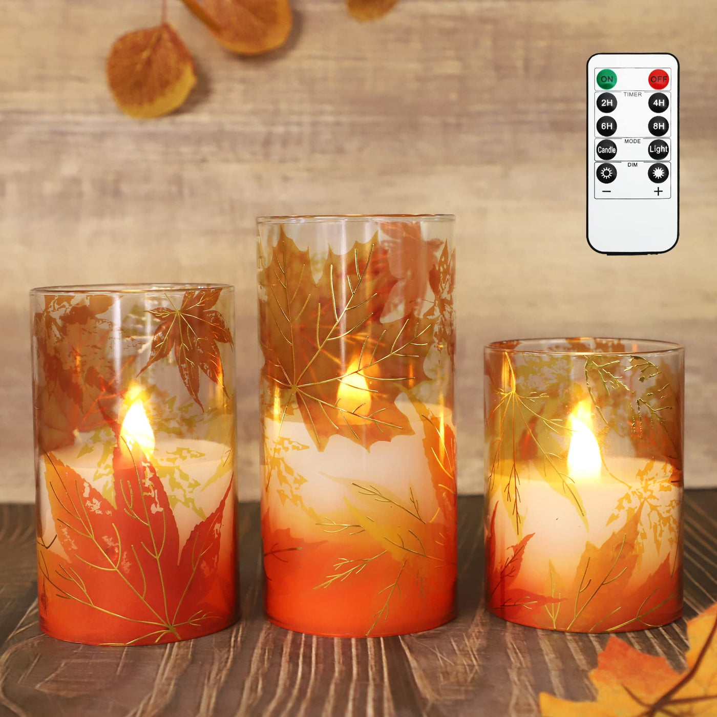 Crystal Club Fall Flameless Candles, Autumn Maple Leaves Led Flickering Candles With Remote And Timer, Battery Operated Glass Ef