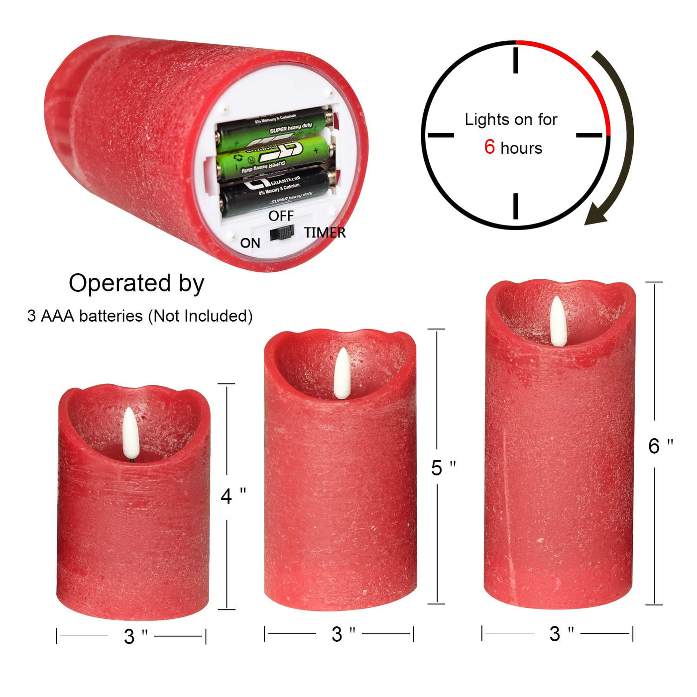 Eldnacele Red Wax Flameless Flickering Candles With 6H Timer, 3D Wick Realistic Battery Operated Pillar Led Candles Set Of 3 For