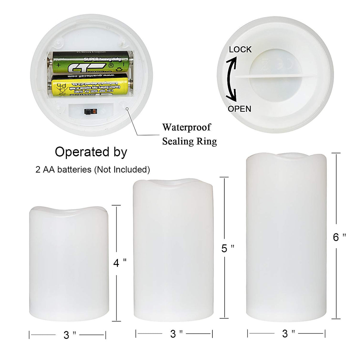 Eldnacele Flameless Flickering Outdoor Led Candles With Remote Timer, 3 Pack Battery Candles Weatherpoof Heat Resistant Candles Outdoor Candles Are Widely Used To Decorate Your Yard, Garden, Patio And For Outdoor Activities, Such As Bbq And Weddings. Would Be Perfect Match With Outdoor Decorative Lanterns. Safety Comes First, There Is No Need To Worry About The Fire Related Hazard, No Smoke, No Drippings, No Allergies, Especially Suit For Families With Kids And Pets. Buy Once For All Seasons, These Weatherproof Flameless Candles Can Be Used In Hot Summer, Cold Winter Even Rainy Days, Waterproof And Won'T Be Melted In Hot Days. Product Features: Material: Wax-Like Plastic Remote: 10-Key Remote Timer: 2H/4H/6H/8H Timer Battery: 2 Aa Batteries(Not Included) Diameter: 3 Inches Height: 4''/5''/6'' Candle Color: White Flame Color: Warm White Flame Mode: Flickering/Steady Light Brightness: Adjustable Timer: Turn On The Candles First And Press The Timer(2H/4H/6H/8H) On The Remote To Set The Timer. For Example, Press 4H At 17:00, The Candles Will Light On From 18:00 To 22:00, And Off From 22:00 Till 18:00 The Second Day, On The Same Time The Seoond Day, The Candles Will Light On Automatically, Cycle Every 24 Hours. Package Including: -1 X Led Outdoor Candle (D3''X H4'') -1 X Led Outdoor Candle (D3''X H5'') -1 X Led Outdoor Candle (D3''X H6'') -1 X 10-Key Remote Control -1 X User Manual Note: 1. Please Remove The Plastic Tab From The Bottom Of The Remote To Activate It. 2. The Remote Only Works When The Bottom Switch In On Postion. 3. There Will Be Slight Battery Drain In Remote Mode Even The Candles Are Not Lit.