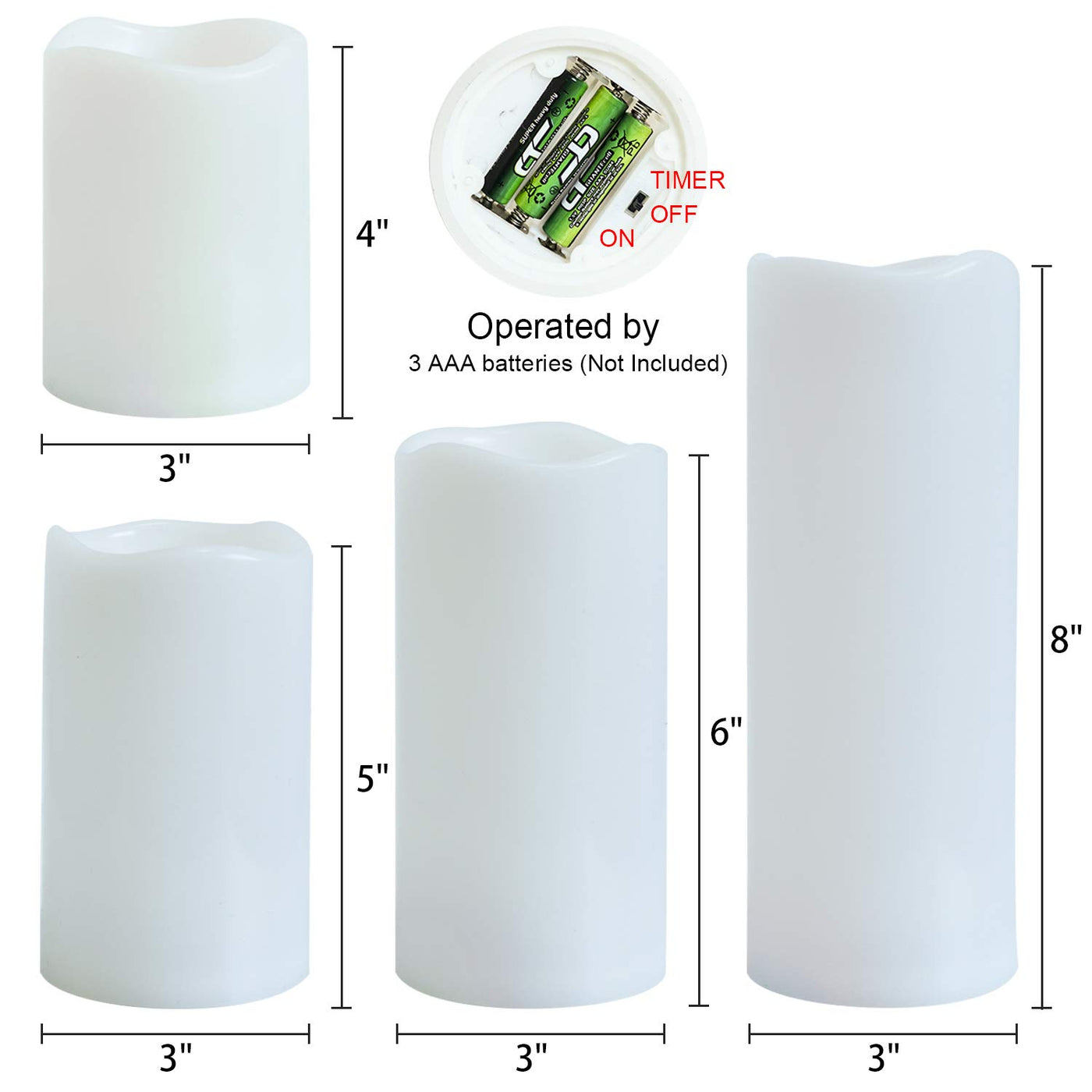 ?Material&Measurement: The Package Including A Pack Of Four Waterproof Flameless Candles With 6-Hour Timer, Made Of Plastic In White Color, The Diameter Of The Candles Is 3 Inches, The Heights Of The Candles Are 4 Inches, 5 Inches, 6 Inches And 8 Inches. Each Candle Operated By 3 Aaa Batteries(Not Included). | ?6 Hours Timer: Built-In 6 Hours Timer Is Easy To Operate And Use, Once Slide The Switch To Timer Position, The Candles Will Light Up For 6 Hours And Automatically Off In The Following 18 Hours, Cycle Every 24 Hours. Easy And Convenient Function To Save The Trouble Of Turning On/Off Candles Manually. | ?Waterproof Outdoor: Unlike Traditional Wax Made Candles, These Plastic Led Candles Not Only Have The Real Wax Candles Appearance And Feelings, But Also Won'T Melt Or Deform Even Under The Direct Sunlight, Waterproof Features Allow You Use Them Even In Rainy Days, These Candles Would Be A Perfect Match With The Outdoor Candle Lanterns As Well. | ?Safe & Clean: With These Waterproof And Heat Resistant Flameless Flickering Led Pillar Candles, You Will Get Rid Of The Worry And Concern Of Fire Hazard, Annoying Smoke And Drippings. Kids And Pets Friendly, Never Worry About Forgetting To Extinguish Candles When Sleeping, Safety Always Comes First. | ?Application & Guarantee: Such Practical And Beautiful Canldes Will Be Your Necessary For Your Home Once You Use Them For A Time, They Can Be Placed In Your Bedroom, Fireplace, Living Room, Bookshelves, Porch, Yard, Garden, Lanterns And Anywhere That You Could Think Of. All The Led Candles From Us Will Have The Warranty Of 90 Days For Replacement Or Refund, Place The Order With Confidence.