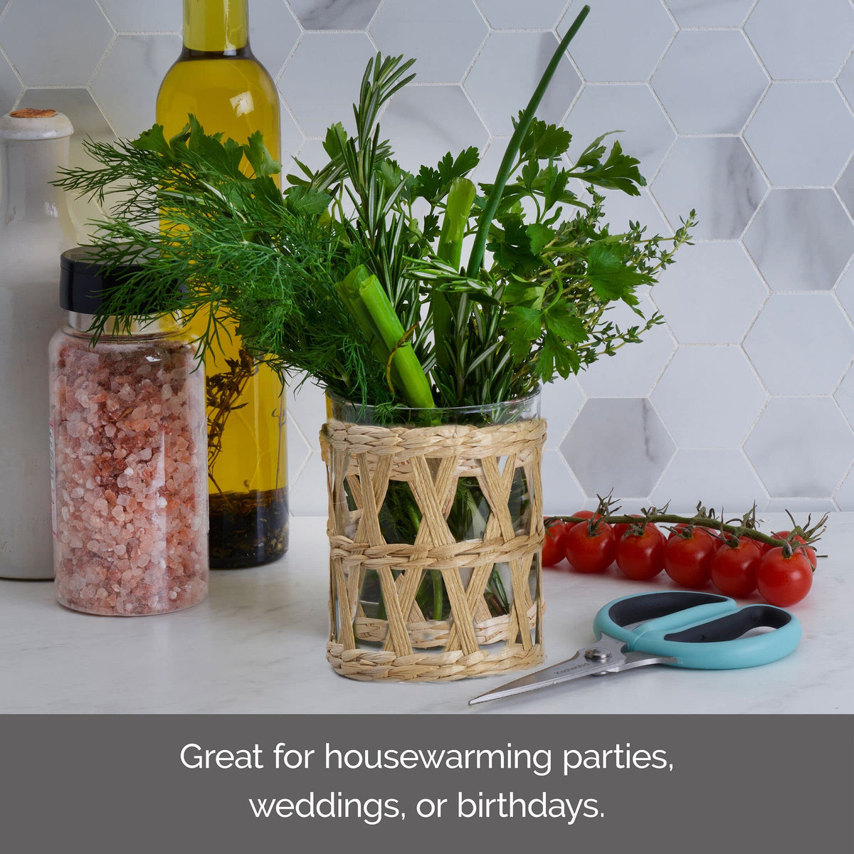 Add A Soft Glow To Any Room With This Seagrass And Glass Hurricane By Elements. Place One Real Or Flameless Candle In This Earthy Holder To Create A Warm Ambience In Any Room. The Seagrass Accent Brings The Beauty Of The Beach To Your Home, Adding A Coastal Look To Your D Cor. Makes A Great Gift. Candle Not Included. Measures 4 L X 4 W X 6 H. .