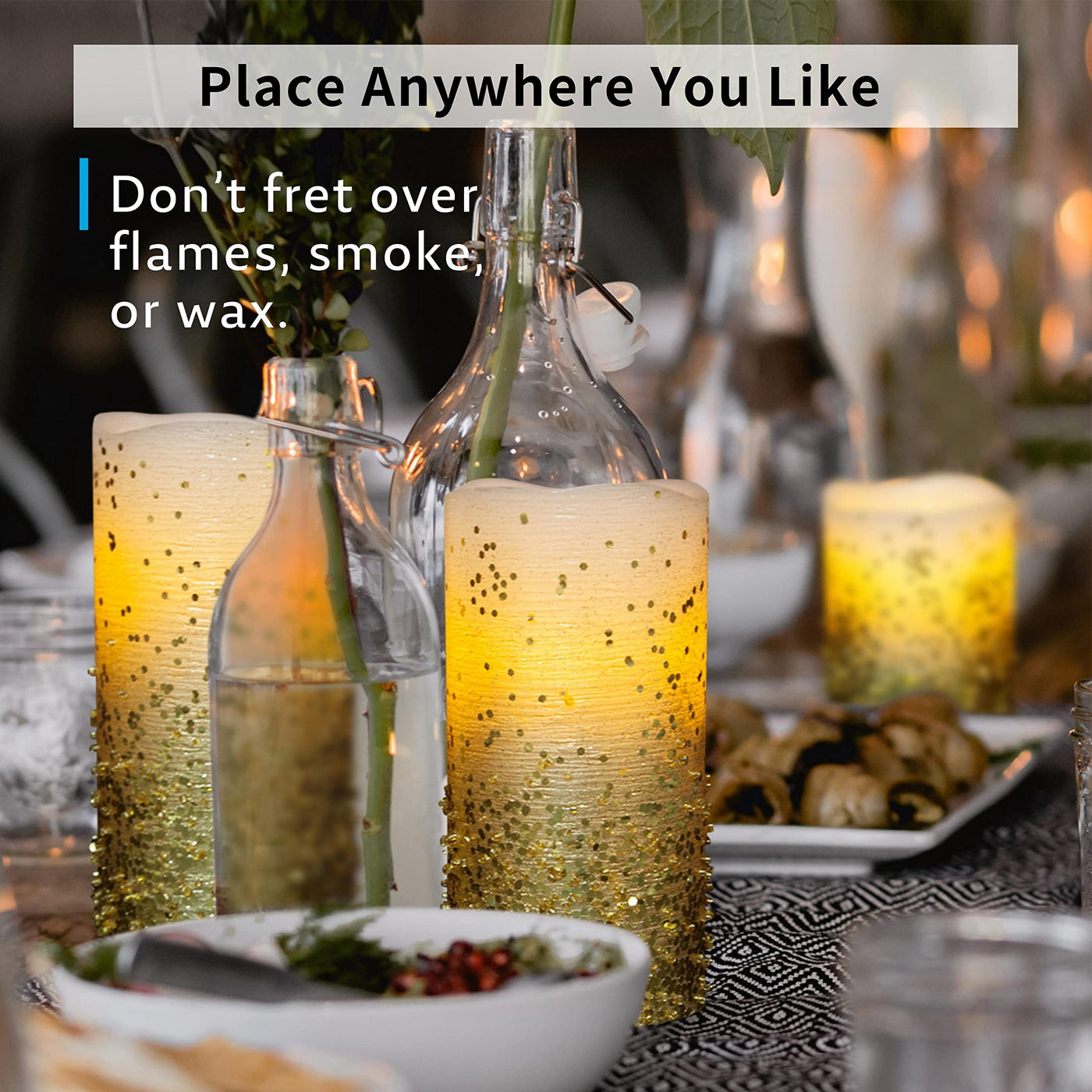 ??? Safe For Kids And Pets: Instantly Create A Festive, Cozy Mood With Our Glitter Led Candles In Gold, Red, Silver, White, And Rose Gold. No Flame, No Mess-Just Warm Candlelight To Enhance Any D?Or. | ??? Effortless Ambiance With Remote & Timer: Control All 8 Candles With The Included Remote. Set 2/4/6/8-Hour Timers For Worry-Free Ambiance-Perfect For A Festive Atmosphere. | ??? Enchant Any Space: Add A Warm, Flickering Glow To Romantic Dinners, Holiday Tables, Mantels, Or Patios. These Versatile Flameless Candles Offer Endless D?Or Possibilities. | ??? Complete 8-Piece Set: Includes 4 Pillar Candles (Two 6'' And Two 4'') And 4 Votive Candles (1.6'' X 1.8''). Remote Control And Batteries Included For Immediate Enjoyment. | ??? Quality Guaranteed: Enjoy Peace Of Mind With Our Trusted, Glittering Led Candles. We'Re Here To Help-Reach Out Anytime With Questions!
