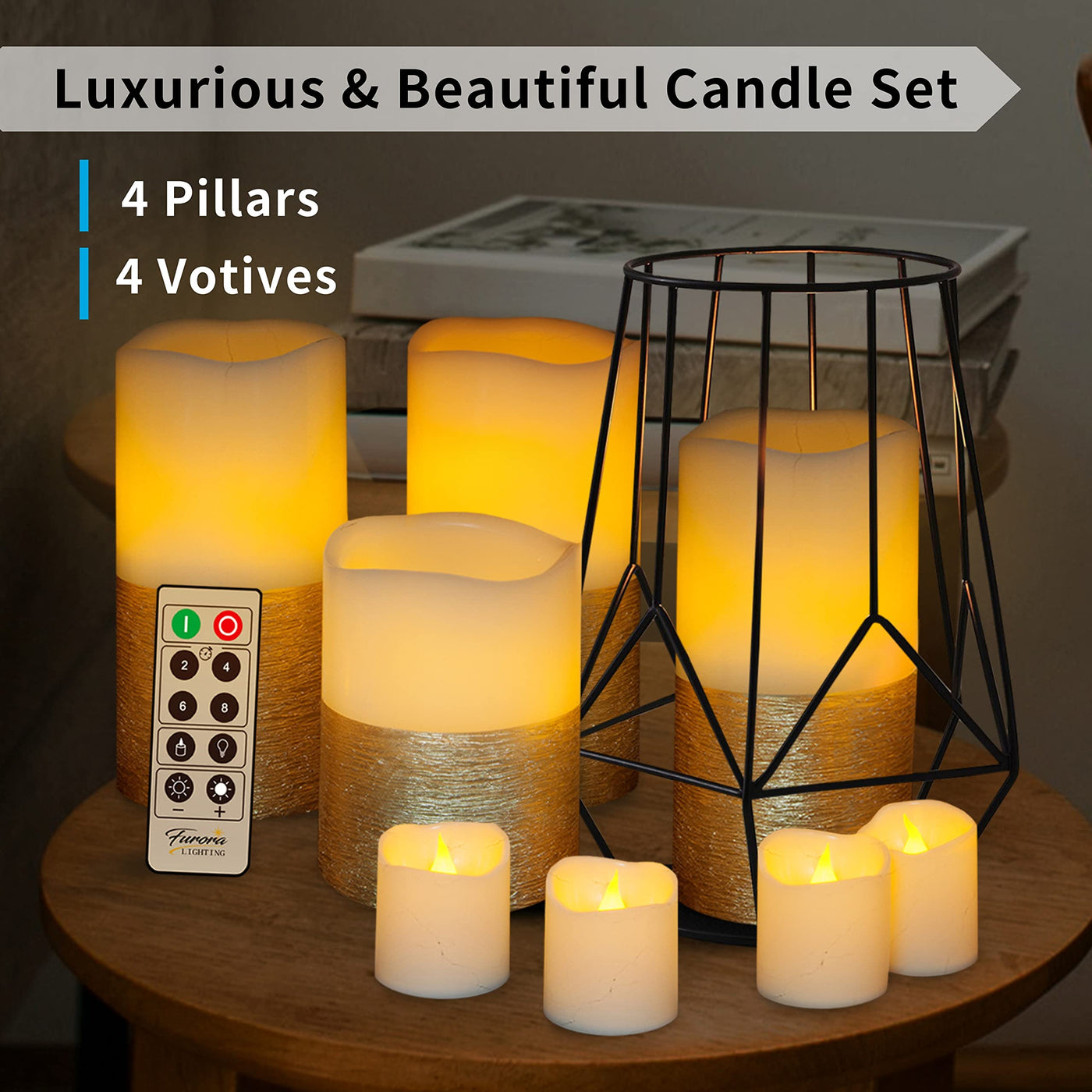 Furora Lighting Gold Real Wax Trim Candles With Remote And Timer, Pack Of 8 Pillar & Votive Candles, Led Flameless Flickering Ca