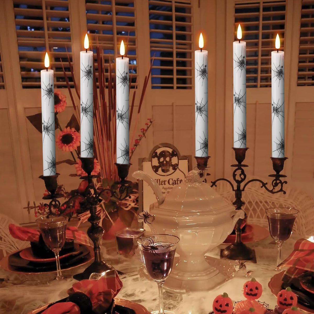 Q: What decorations work well with these Halloween taper candles?A: The GenSwin flameless taper candles with spider web prints are perfect for Halloween decorations. They can be paired with candlesticks, placed as table centerpieces, or used alongside pumpkins to enhance your spooky decor.