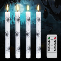 Genswin 4Pcs Halloween Flameless Flickering Taper Candles With Remote Timer, Real Wax Led Taper Candles Battery Operated With 3D Flame And Spider Prints For Halloween Spooky Decoration