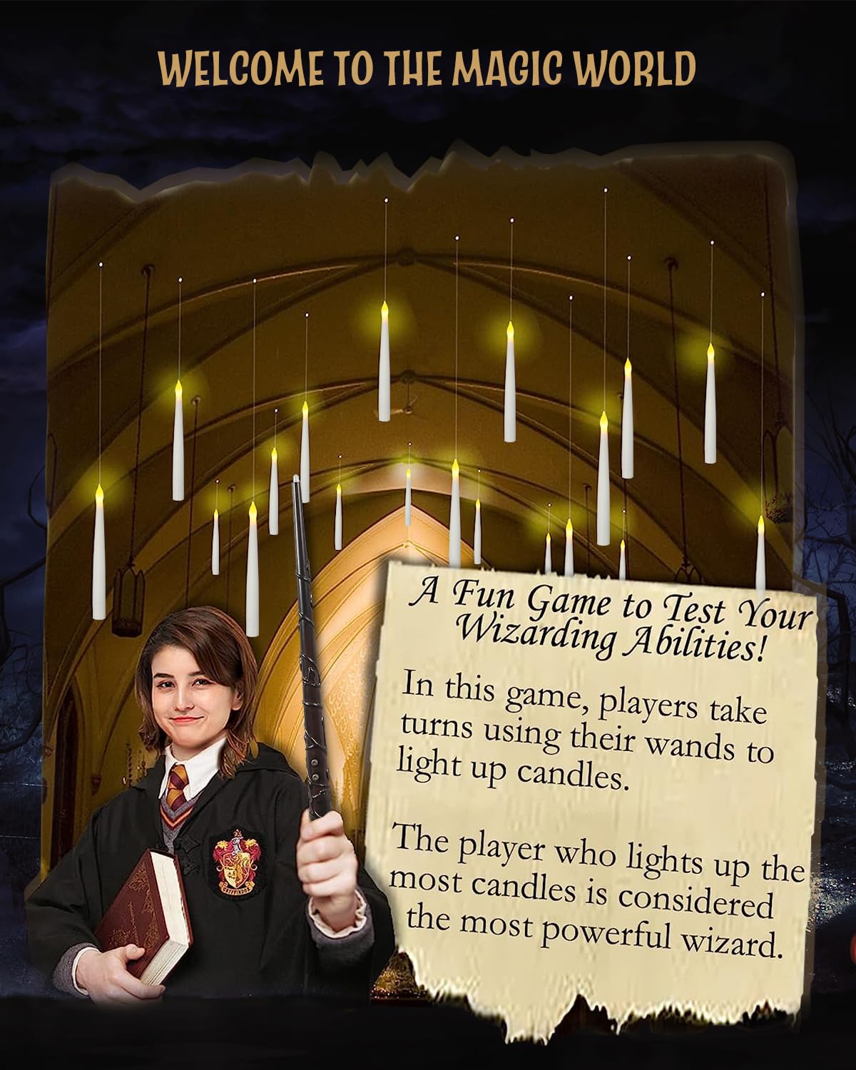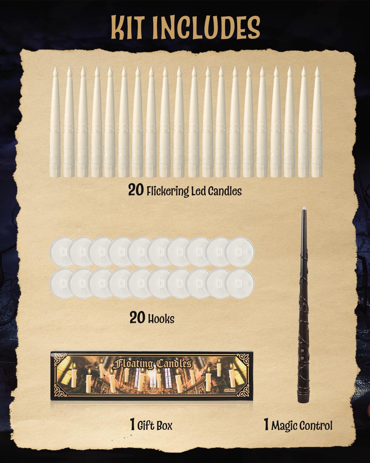 Features Elevate Your Halloween Decor With This Set Of 20 Floating Flameless Led Candles. Our Flickering Candles Are Designed To Bring A Magical Touch To Any Room, Creating An Enchanting Atmosphere For Your Halloween Festivities. With A 4-Foot Transparent Fishing Line Attached To Each Candle And 20 Hooks Included, You Can Effortlessly Hang These Candles In Your Bedroom, Classroom, Or Living Area. Each 6.8-Inch Candle Is Controlled By A 13-Inch Magic Wand Remote, Allowing You To Light Up Your Space With A Wave Of Your Hand. Advantages 20-Piece Set: With 20 Candles Included, You Have Ample Decor For Your Halloween Event. Flameless Design: These Candles Are Flameless, Ensuring A Safe And Worry-Free Experience. Magic Wand Remote: The Magic Wand Remote Adds An Element Of Fantasy To Your Halloween Decor, Allowing You To Control Your Candles With Ease. Flickering Effect: These Led Candles Give Off A Flickering Light That Mimics Real Candles, Adding A Warm And Spooky Ambiance To Any Room. Easy Setup: The Transparent Fishing Line And Hooks Make It Easy To Hang These Candles, And The Candles Run On Aaa Batteries (Not Included), Allowing For Hassle-Free Installation. Benefits Unique Atmosphere: Create A Spooky And Magical Atmosphere That'S Perfect For Halloween Parties And Gatherings. Safety First: These Flameless Candles Are A Safe Alternative To Traditional Candles, Eliminating The Risk Of Fire. Versatile Use: Suitable For Indoor Use, These Candles Can Be Used To Decorate Your Bedroom, Living Room, Or Classroom. Effortless Control: With The Magic Wand Remote, You Can Easily Turn The Candles On Or Off And Control Their Flickering Effect. Complete Package: The Set Comes With Everything You Need To Hang And Operate The Candles, Making Setup A Breeze. Evidence Enhance Your Halloween Decor With These Floating Led Candles. The Flameless Design Ensures Safety, While The Flickering Effect Creates A Realistic Candlelight Ambiance. The Magic Wand Remote Adds A Fun And Magical Touch