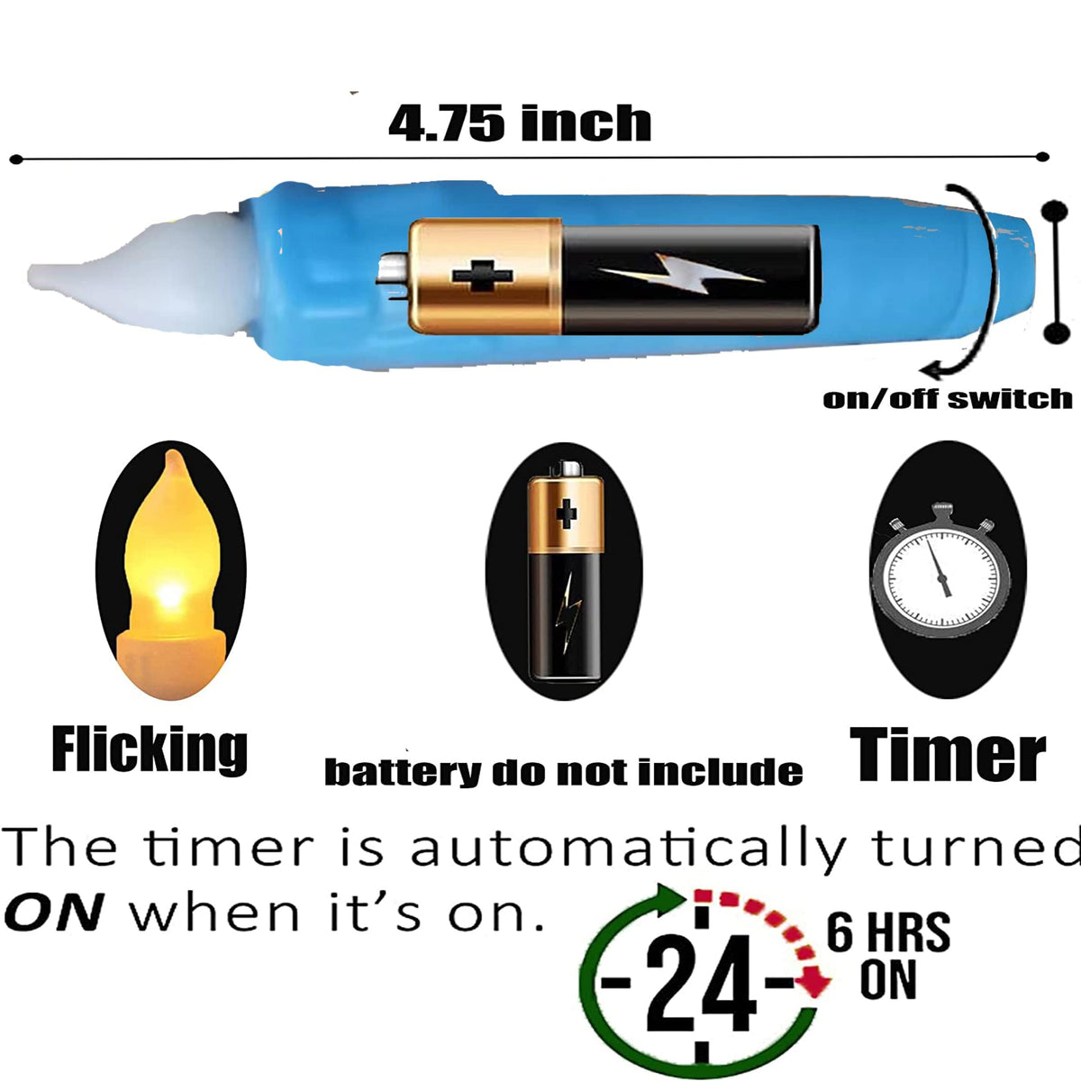 Q: How do the timer functions work for the battery-operated taper candles?A: The timer function for the battery-operated taper candles allows them to stay on for 6 hours and then automatically turn off for 18 hours. This cycle begins when you insert the batteries, making it easy to manage your candle's lighting schedule.