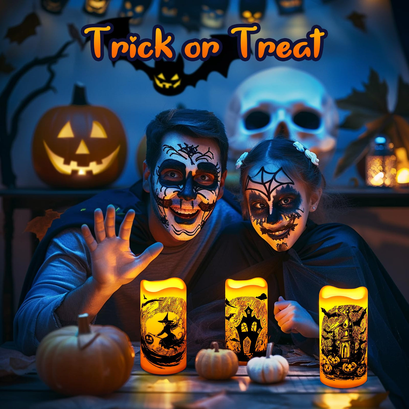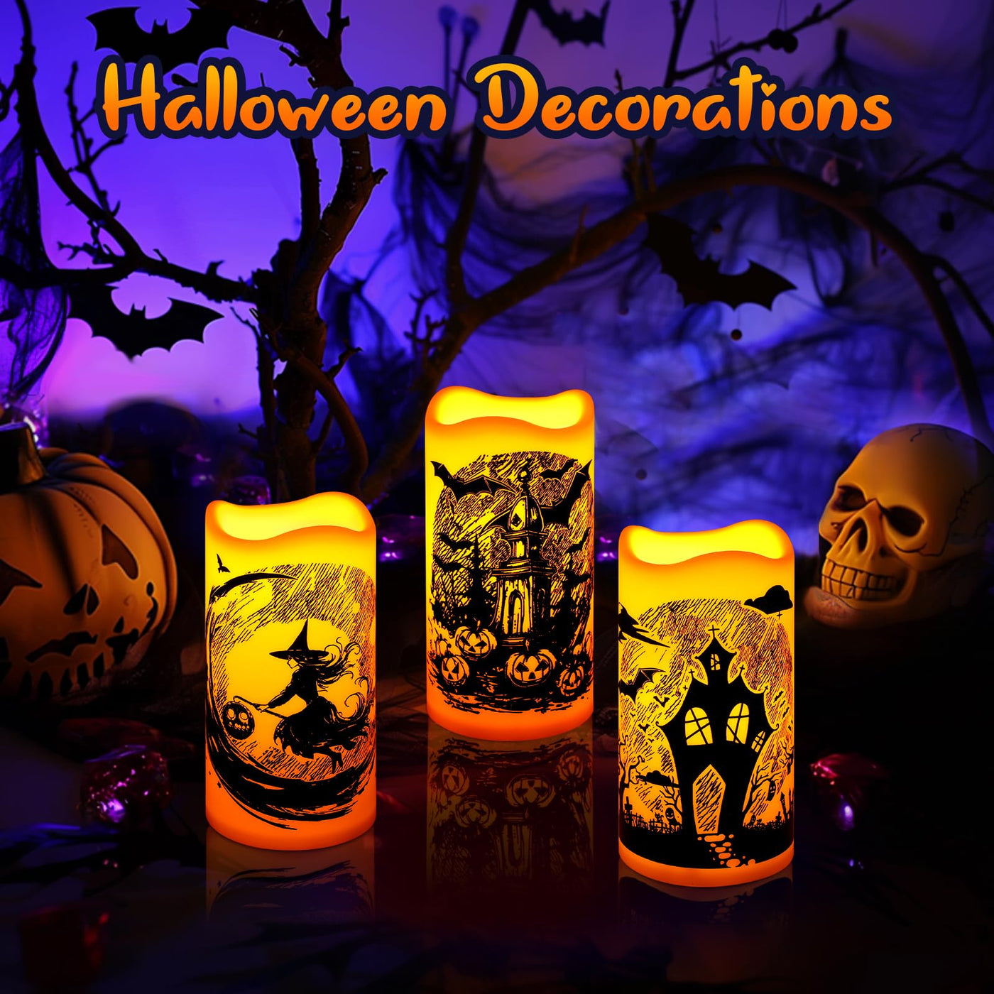Linkax Halloween Indoor Decorations Flickering Flameless Candles Set Of 3 With Witch Bat Castle. Enhance The Spookiness And Horroriness Of Your Halloween Decorations At Night With Our Halloween Led Candles Halloween Decorations: Halloween Flickering Flameless Candles Are Suitable For Fireplace,Mantle, Windows, Tables, Wall, Porches, Display Cabinet, Bookshelves,Living Room,Bedroom. Halloween Gifts: A Perfect Choice As Halloween Gifts For Kids, Friends, Parents And Relationships Product Features: Size: 3Inch W*6Inch H Powered:Battery Powered Timer: 6 Hours Timer Switch: On-Off-Timer Quantity: 3Pcs