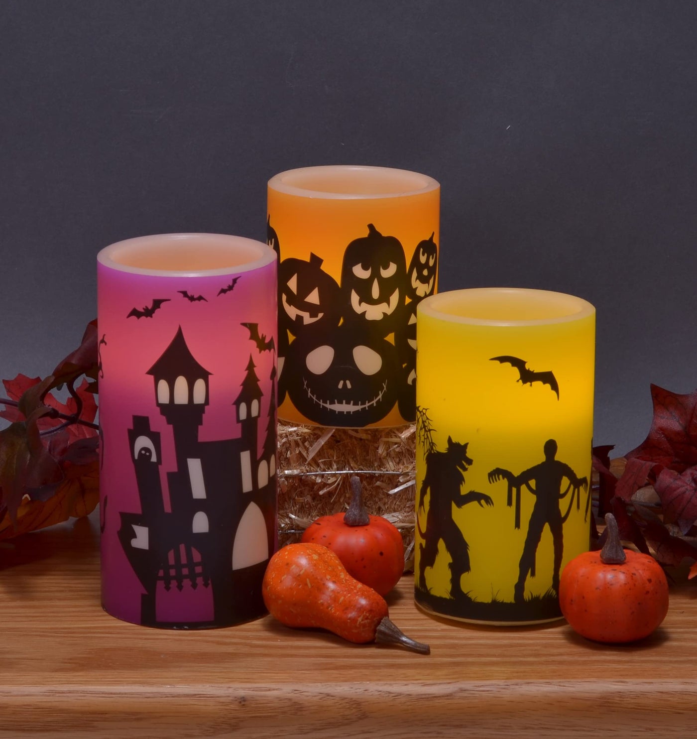 Set The Scary Mood For The Festive Occasion With Our 3-Piece Halloween Flameless Led Pillar Set That Will Paint A Room In Eerie Ambiance. The 4-Inch, 5-Inch & 6-Inch Real Wax Pillars Feature Halloween-Themed Silhouettes That Are Each Brought To Life By A Battery-Operated Led That Provides A Safe, Warm Glow Like Real Candlelight. As A Bonus, Each Candle Includes A Convenient 6 Hour, 18 Hour Off Timer. The 3-Piece Halloween Pillar Set Will Make For An Ideal Centerpiece For The Holiday Season. Set Includes: (1) 4-Inch Orange Pillar With Pumpkins Silhouette (1) 5-Inch Yellow Pillar With Monsters/Werewolves/Witches/Bats Silhouette (1) 6-Inch Purple Pillar With Haunted Houses/Bats/Black Cats Silhouette