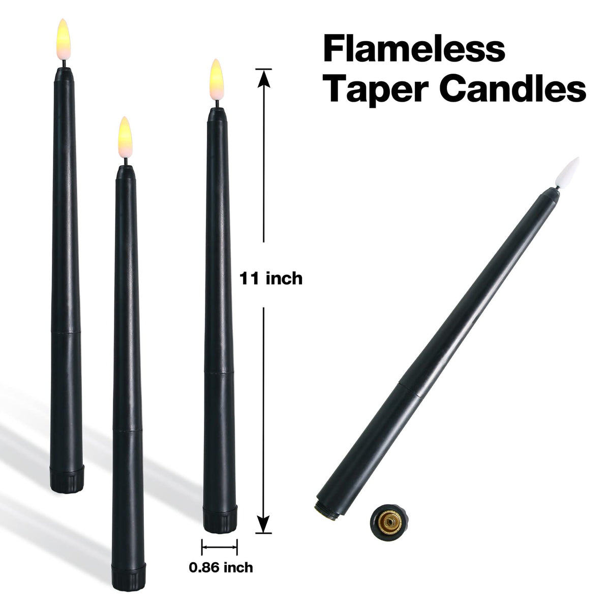Ni-Jasw Black Flameless Taper Candles With Remote Set Of 12Specificationsize:28Cmx2.1Cm = 11 Inch X 0.82 Inchpackage Includes: 12 Pieces Battery Taper Candles, 1 Remote Controlbattery Type:Each Led Taper Candle Takes 2 Aaa Batteries(Not Included), Lasting Over 300 Hours, Remote Control Takes 1 Cr2032 Coin Cell( Included)Features10 Key Remote Controlled Candles - You Can Use Remote To Control Power, Set 2/4/6/8 Hours Timer, Set Flickering Or Static Flame Effect And Adjust Brightness, Max Remote Range 20 Ftrealistic & Safe - It Is Hard To Tell The Difference From Real Candles, Giving Off Warm White Glow, Great Alternative To Real Candles And Safe, No Fire-Risk, No Drips, Especially Great For Kids Or Pets, Great Decoration For Home, Halloween Decorative Candles, Party, Wedding And Also A Wonderful Gift.
