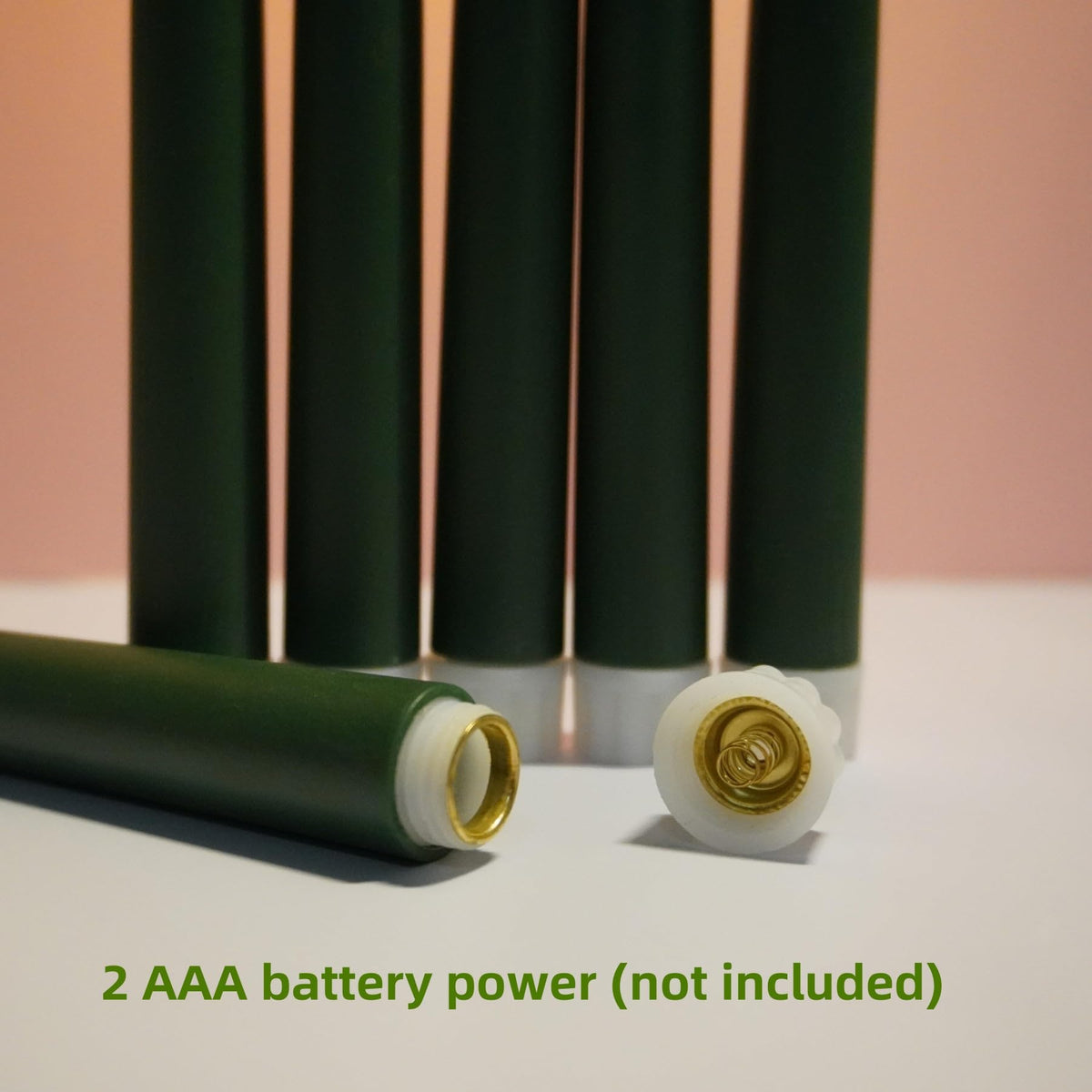 Ni-Jasw Emerald Green Flameless Taper Candles With Remote Set Of 12Specificationsize:28Cmx2.1Cm = 11 Inch X 0.82 Inchpackage Includes: 6 Pieces Battery Taper Candles, 1 Remote Controlbattery Type:Each Led Taper Candle Takes 2 Aaa Batteries(Not Included), Lasting Over 200 Hours, Remote Control Takes 1 Cr2025 Coin Cell( Included)Features10 Key Remote Controlled Candles - You Can Use Remote To Control Power, Set 2/4/6/8 Hours Timer, Set Flickering Or Static Flame Effect And Adjust Brightness, Max Remote Range 20 Ftrealistic & Safe - It Is Hard To Tell The Difference From Real Candles, Giving Off Warm White Glow, Great Alternative To Real Candles And Safe, No Fire-Risk, No Drips, Especially Great For Kids Or Pets, Great Decoration For Home, Halloween Decorative Candles, Party, Wedding And Also A Wonderful Gift.