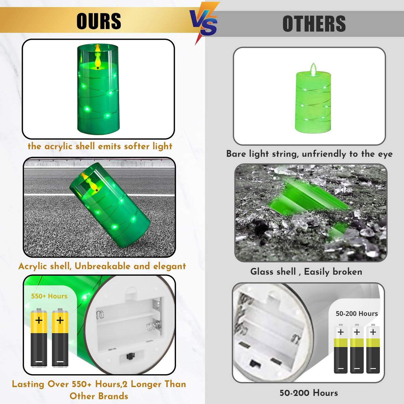 Experience The Warmth And Elegance Of The Nurada Flickering Flameless Candles, Designed With An Innovative Embedded Starlight String Technology. These Battery-Operated Led Pillar Candles, Available In A 3-Pack Of Green, Feature A High-Quality Acrylic Shell That Is Both Unbreakable And Lightweight. Each Candle Measures 3 X 1.8 X 4-5.5-6 Inches And Emits A Soft, Warm Light Accompanied By A String Of 12-16 Leds, Creating A Classic And Noble Atmosphere. The Remote Control, With A Range Of 18 Feet, Allows For Easy Operation, Including Adjusting Brightness, Changing Light Modes, And Setting Timers For 2, 4, 6, Or 8 Hours. Ideal For Various Occasions And Settings, These Flameless Candles Offer A Safe, Long-Lasting, And Versatile Decoration Solution For Your Home, Garden, Or Special Events. The Package Includes Three Candles, One Remote Control, And A User Manual. Please Note That The Required 2 Aa Batteries Are Not Included.