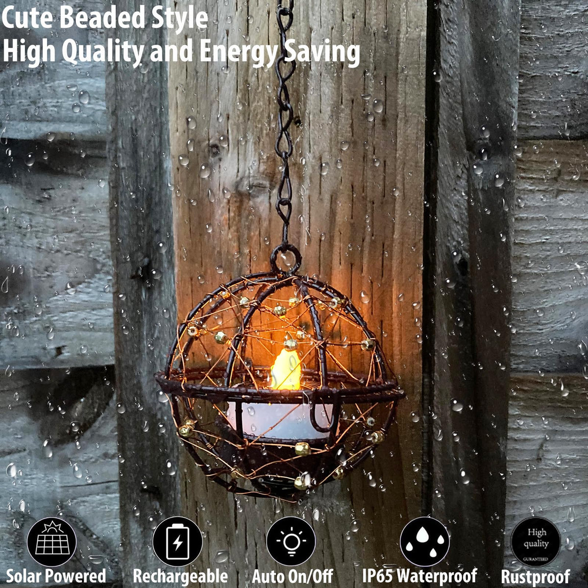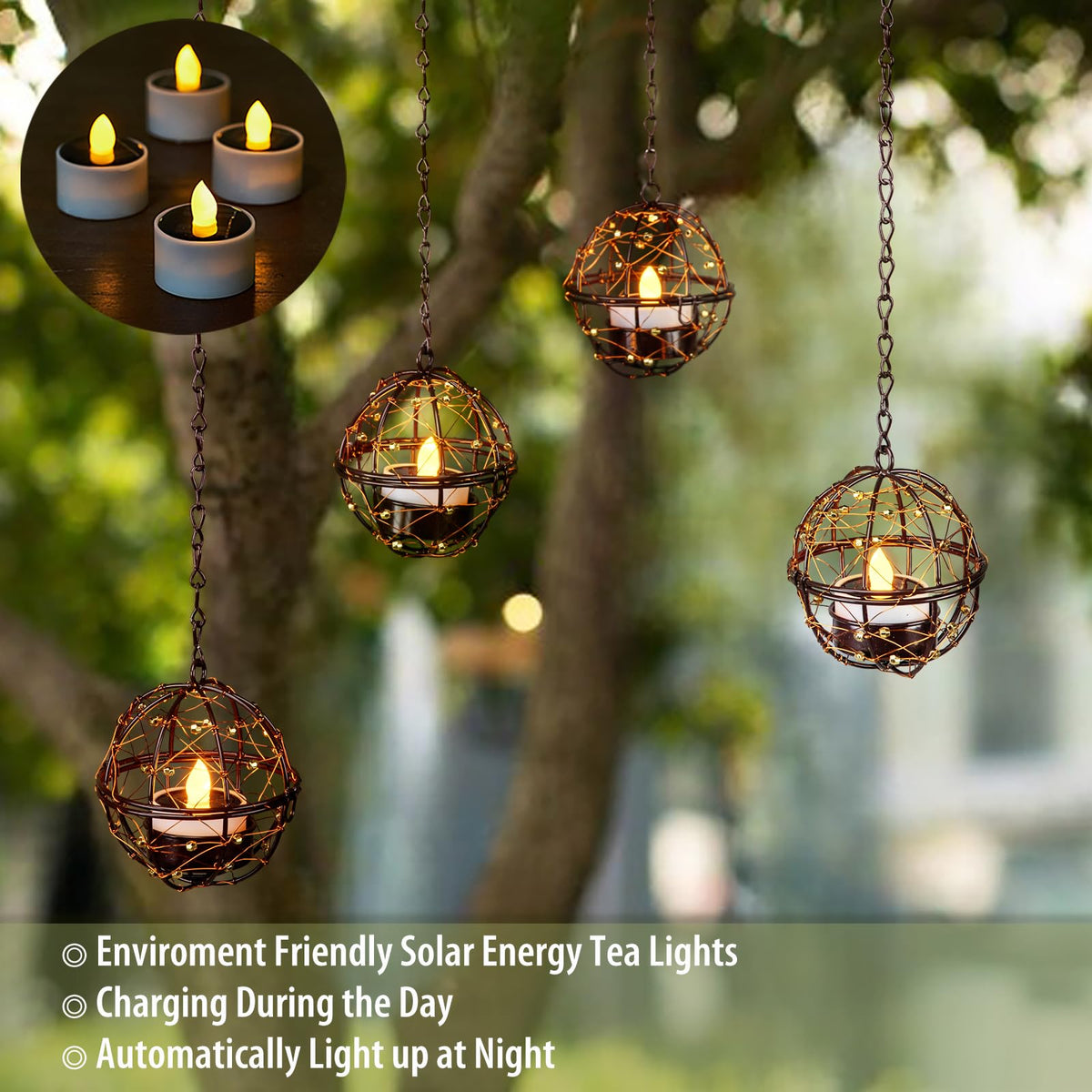 Outdoor Solar Hanging Lanterns Waterproof, Globe Hanging Candle Holder With Flickering Solar Powered Tea Lights, Chargeable Sola