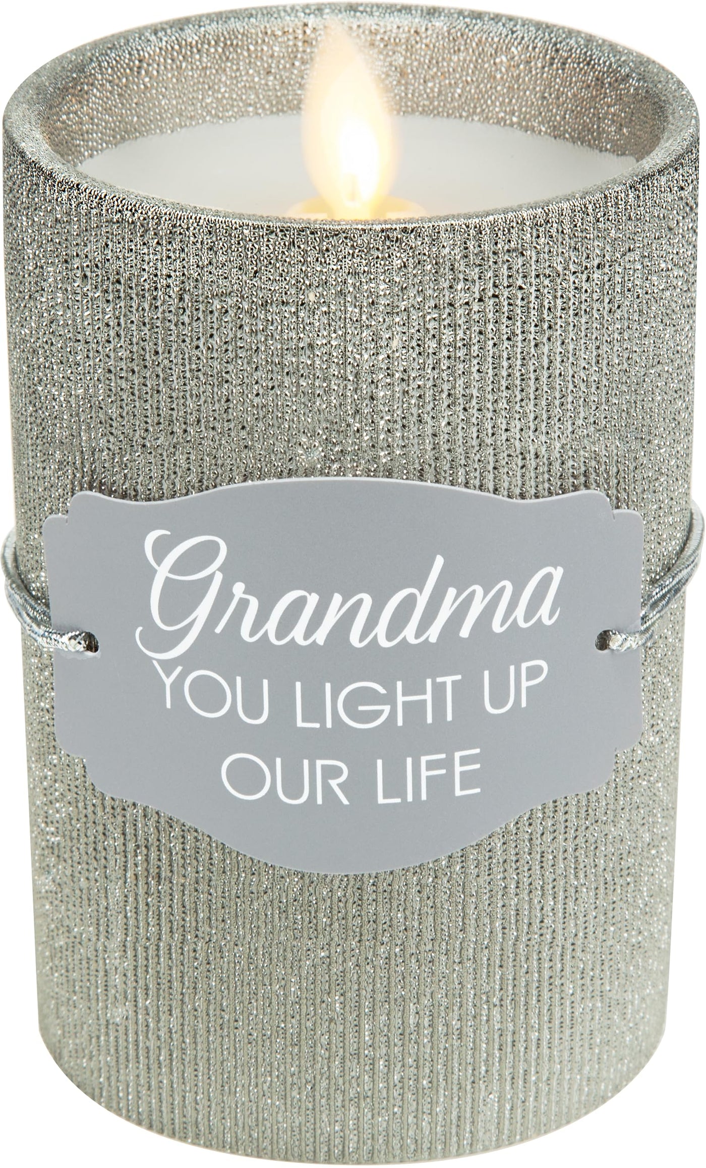 Q: What makes the Pavilion Gift Company Grandma candle unique?A: The Pavilion Gift Company Grandma candle features a realistic LED flame that flickers like a real candle, providing a cozy ambiance without the hazards of an open flame. It also includes a sentimental message, 'Grandma; You Light Up Our Life', making it a heartfelt gift for grandmothers.