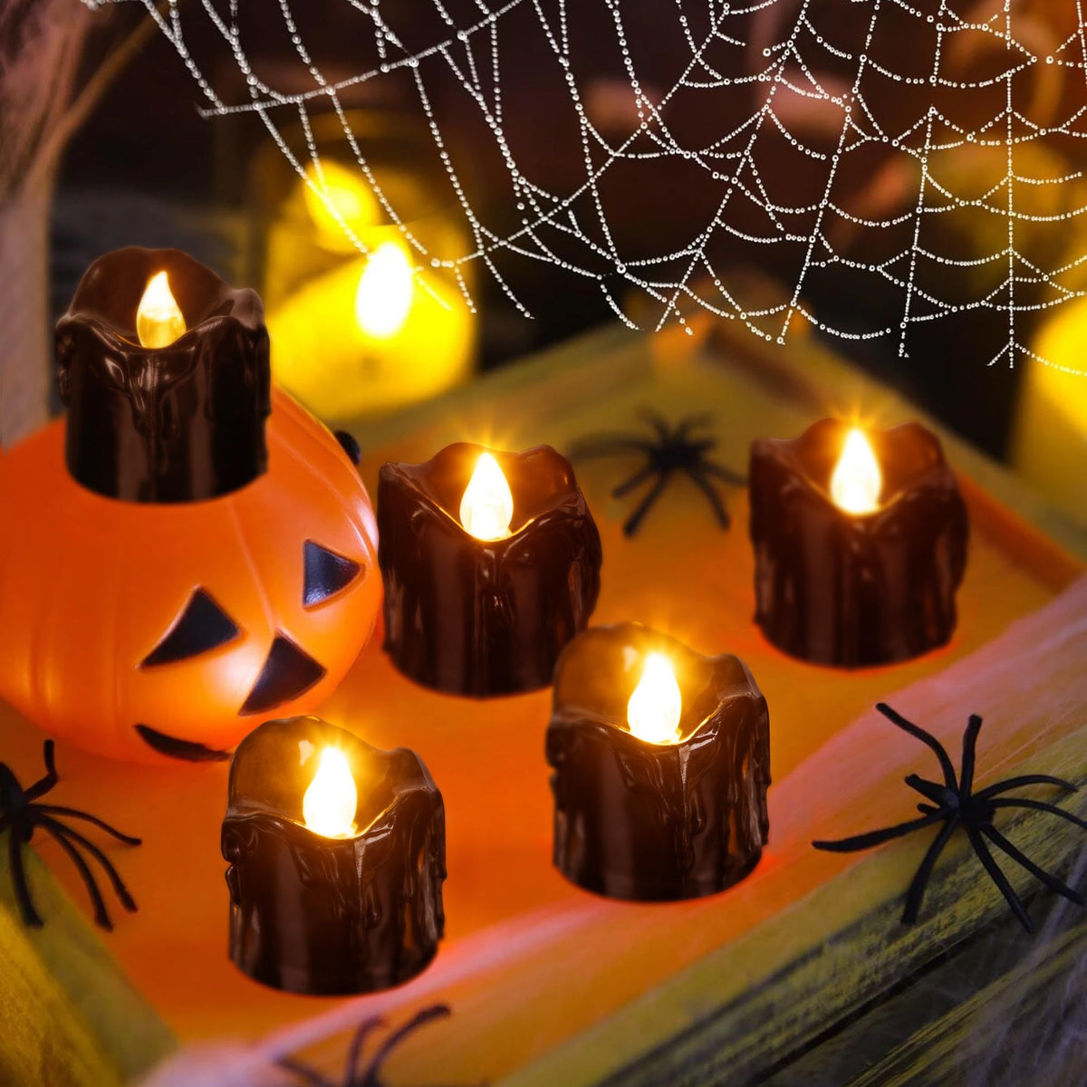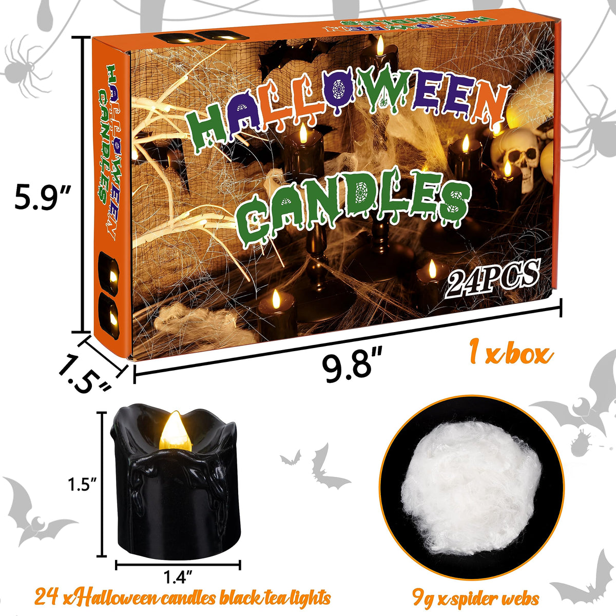 24Pcs Halloween Decorations Indoor Candles Black Tea Lights: Led Flameless Tealight Battery Operated Table Decor With Spider Webs (No Timer&Remote)