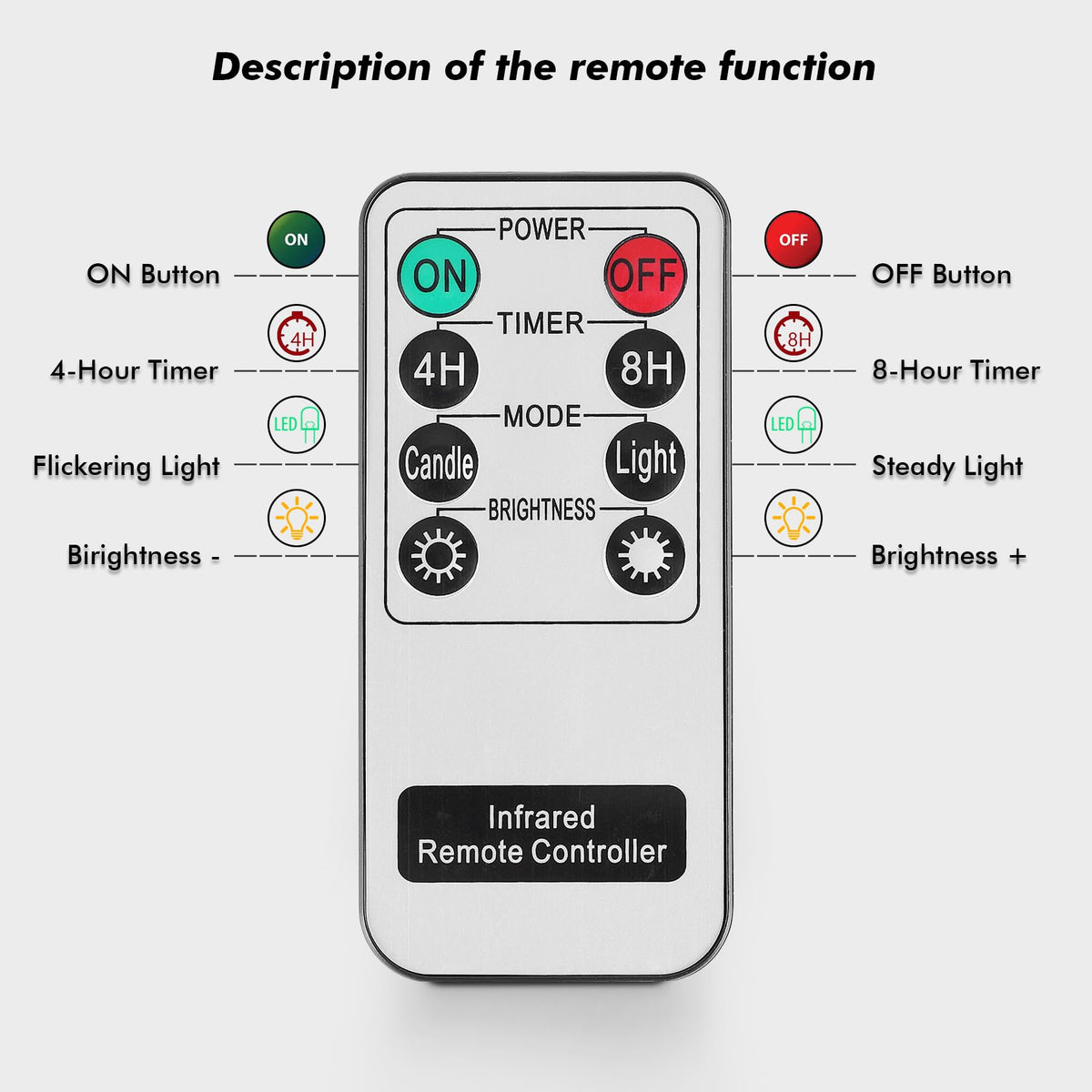 Q: How long do the included batteries last for these flameless candles?A: Each flameless candle is powered by 2 AA alkaline batteries, which are included in the set. The batteries can last for over 200 hours, ensuring long-lasting use.