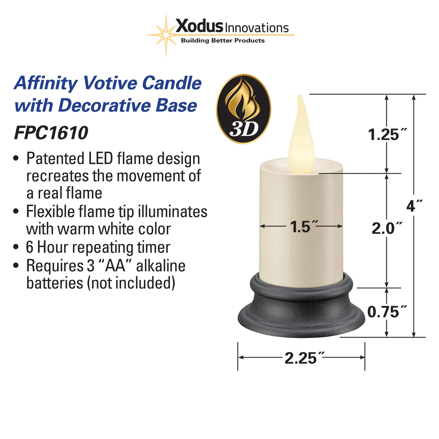 The Affinity Battery Operated 3 Inch Votive Candle With New 3D Technology Led Flame Recreates The Movement Of A Real Candle Flame. It Has A Warm White Flame Color That Can Be Turned On Or Off By Just Tilting The Candle. It Also Has A Timer That Will Turn On The Same Time Everyday For 6 Hours. You Can Use It With Or Without The Decorative Base. Safe Around Children And Pets Because There Is No Hot Wax Or Dangerous Flame. With An Led Light Source You Will Never Need To Replace The Bulb. The Candle Uses 3 Aa Alkaline Batteries (Sold Separately).