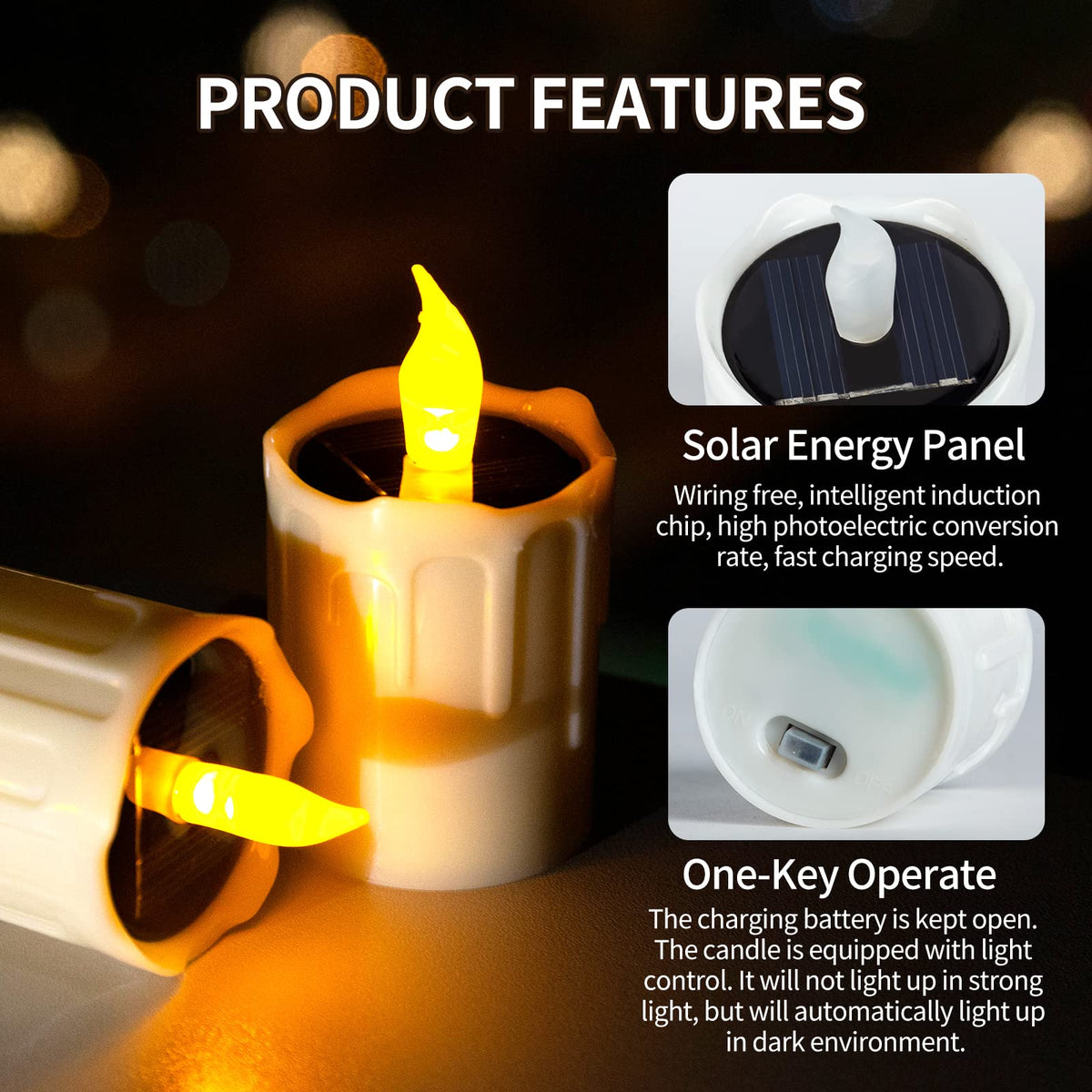 What Will You Have? * Pack Of 6Pcs Solar Tea Lights. (Rechargeable Batteries Included.) &Nbsp; * Size: 1.69'' D X 2.24'' H. Perfect Size For A Candle Chadelier. &Nbsp; * Warm White Flickering Light, It Will Present You A Soothing Environment. &Nbsp; Waterproof: The Whole Sealing Process Design, 100% Waterproof. You Can Put These Candles In A Transparent Glass Jars Or Lampshade For Outdoor Using. Our Tealights Can Light In The Rainy Night. Occasions: Bedroom, Bar, Church, Garden, Living Room, Bath Room, Party, Family Dinner And Outdoor Picnic Etc. Easy To Use: Using: Turn The Solar Candles On In The Bottom Of It, Then Put The Tea Lights In The Dark Environment And The Candles Will Light Up. Charging: Put The Solar Panels Of Candles Directly Under The Sunshine, It Will Turn The Sunshine Into Electronics And Charge The Batteries Of The Candles. &Nbsp; Using Tips: Please Charge First When Using It For The First Time, Since It Has No Power When You Get It When Absorbing Light Energy, Make Sure That The Top Of The Tea Light Can Be Exposed To Sunlight Outdoor Waterproof Design, But Can Not Be Immersed In Water When Not In Use For A Long Time, It Is Recommended To Turn Off The Bottom Switch To Maintain Battery Health