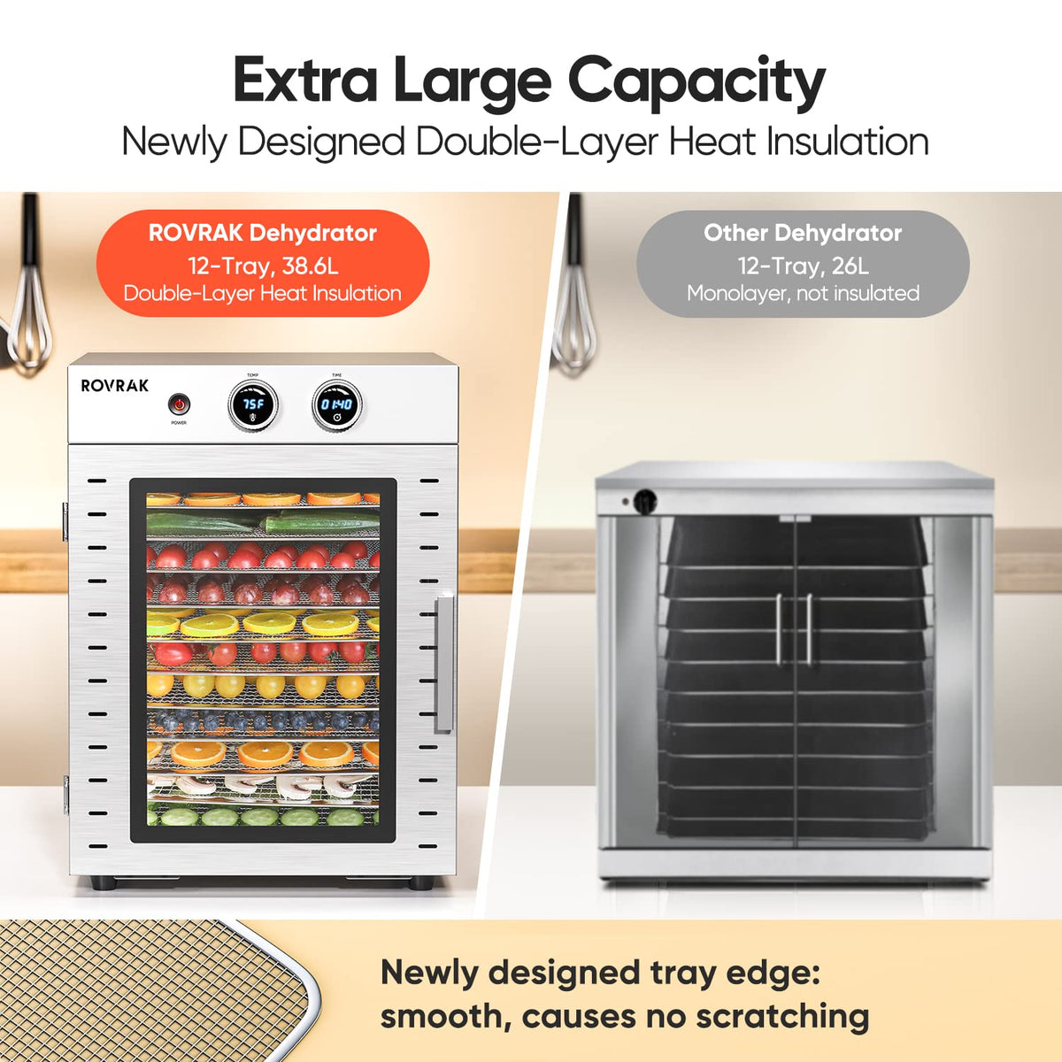 Double-Layer Heat Insulation: Newly Upgraded Double-Layer Stainless Steel Design Prevents The Surface Of The Machine From Overheating And You From Being Scalded. Note: The Voltage Is 120V 60Hz, And The Power Is 1000W, Only Applicable To Usa And Canada. | Large Capacity: The Food Dehydrator Comes With 12 Trays, Each Tray Is 12.5X12.5 Inches, Suitable For Families Who Need To Make A Large Number Of Food. Large Drying Space Is Perfect For Dehydrating Various Fruits, Vegetables, Meat, Herbs, Etc. | Digital Control: The Time Can Be Precisely Controlled From 30 Minutes To 24 Hours In 30-Minute Increments By Using The Digital Control Panel. And The Temperature Can Be Adjusted Precisely Between 70? - 190?. | Safe To Use: One Minute Before The Timer Is Up, The Automatic Shutdown Function Will Be Started Immediately, And The Cold Air Will Be Automatically Blown To Cool The Machine. If The Inside Of The Dehydrator Is Overheated, The Overheat Protection Function Will Be Activated. | Silent Operation: The Integrated Hot Air Circulation Drying Evenly Heats All The Trays To Ensure More Uniform Drying And Less Noise Generation. 67 Recipes, 1 Drip Tray, 1 Silicone Glove And 4 Silicone Mats Are Given Away For Free. If You Have Any Questions, Don'T Hesitate To Contact Our Customer Service Team.