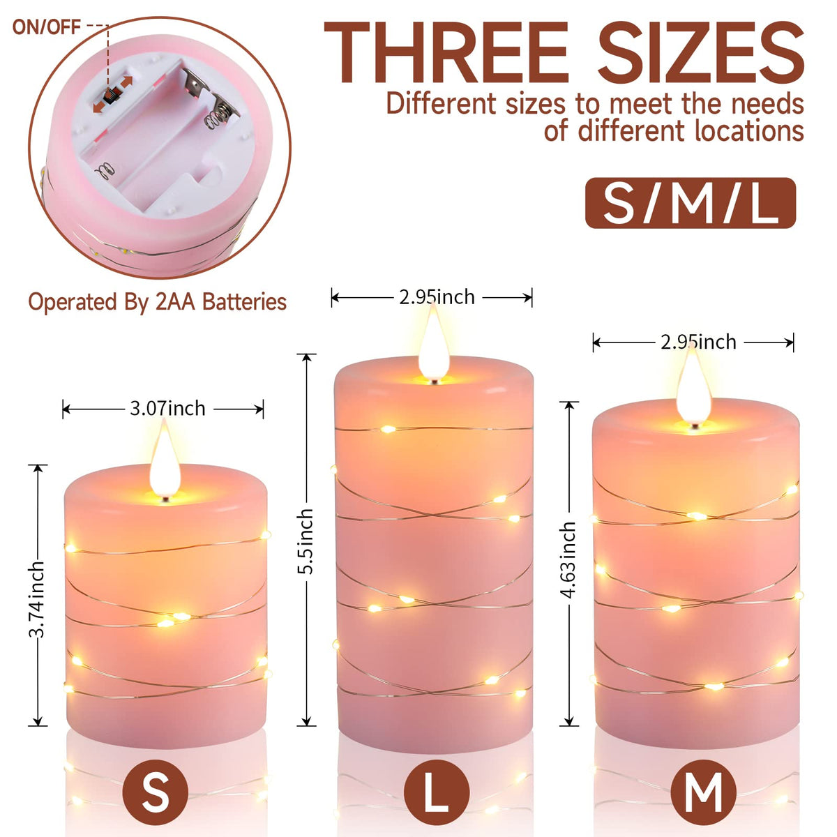 Flameless Candle With Built-In Led With Starry String Lights Technology: Each Candle Is Surrounded By Bright And Delicate Light. Wrapped In A Silver-Finished Light String, This Is A Unique Aesthetic Effect That Combines The Appearance Of A Fairy Lamp With The Classic Beauty Of A Real Flame Candle, Showing A Classic And Noble Atmosphere. Powerful 10-Key Remote Control: Press The No Button Twice To Independently Control The Starlight String. After Setting The Timer, Light The Candle At The Same Time Every Day, The Duration Is 2 Hours / 4 Hours / 6 Hours / 8 Hours Feature: Dancing Flames 360 Degree Viewing Angle Built-In Light String Real Wax, Bring Soft And Natural Luster Five-Column Pillar Candle Each Candle Requires 2 ''Aa'' Batteries (Not Included) Package Contents: One Remote Control A Copy Of The Manual One 3.15X 4 Inch Pillar Candle One 3.15X 5 Inch Pillar Candle One 3.15X 6 Inch Column Candle Note: Because This Embedded Fairy Light Candle Contains A Lot Of Led Lamp Beads, The Energy Consumption Is Higher Than Other Ordinary Led Flameless Candles, So It Is Recommended That You Use Recyclable Environmentally Friendly Batteries.