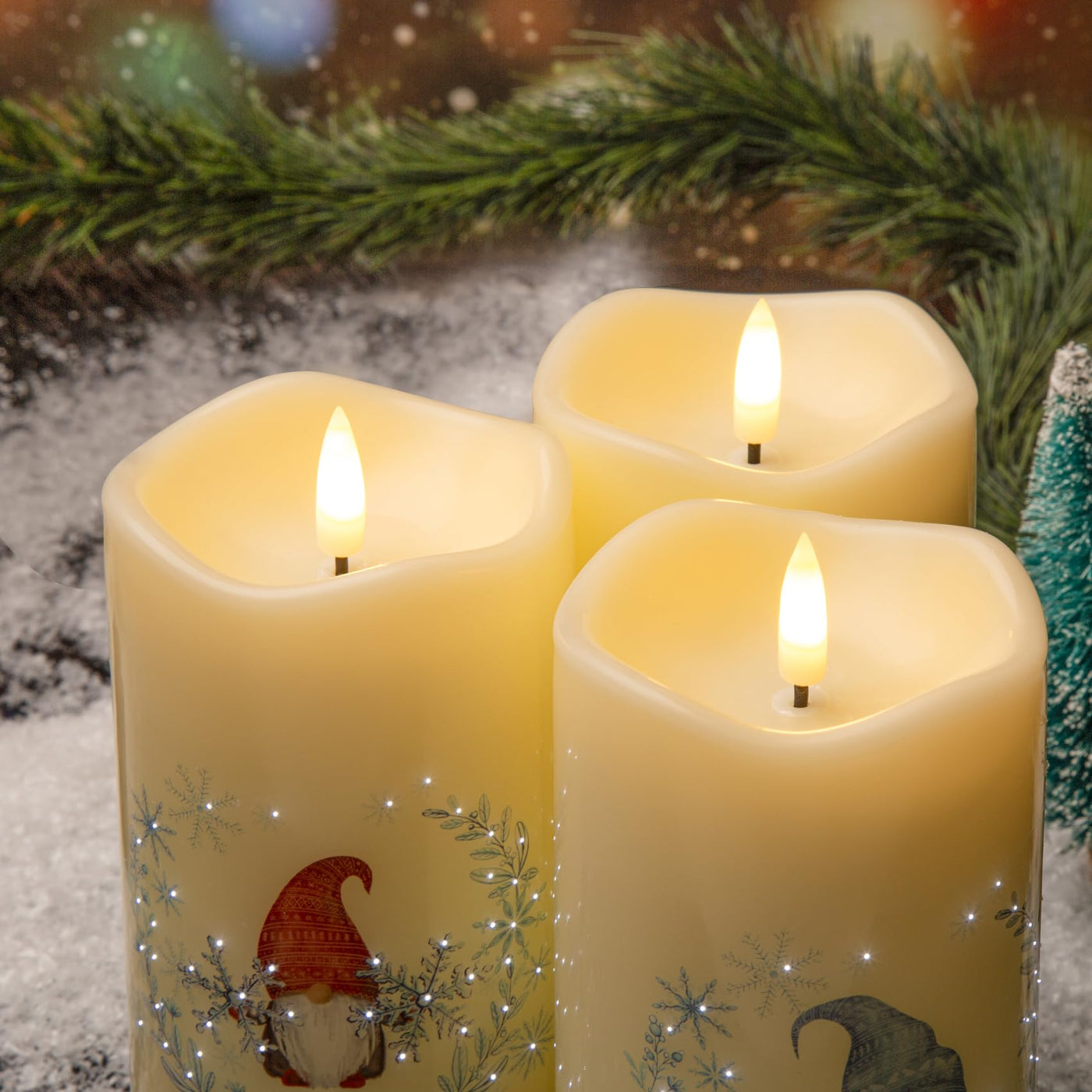 Eywamage Christmas Flameless Led Decorative Candles With Remote Set Of 3, Battery Operated Flickering Pillar Candles F 3'' H 6'' Realistic Flameless Candles - The Newest Flame Stimulation Technology Makes These Led Candles With So Realistic Wick And Flickers So Beautifully And Convincingly, Bringing A Realistic Flame Experience That You And Your Guests Will Be Definitely Impressed.Convenient Remote Control - You Don'T Leave Your Cozy Bed To Open/Close These Candles Manually, All Candles Are Easily Operated Through The Remote Control( On/Off,2/4/6/8 Hours Timer,Set Flickering/Static Flame Effect ).Pretty Design & Safe Decorations - Candles Are Decorated With Beautiful Patterns And Flickering Lights, These Flameless Candles Are Battery Operated, No Fire Risk, No Smoke, No Unpleasant Scent Or Or Messy Dripping Wax, Perfectly Applied To Christmas Decoration And Gifts Battery Operated Candles - Each Candle Is Powered By 3 Aa Batteries (Not Included), Lasting Over 350 Hours, Led Bulb Works For 50000+ Hours.Package Includes:-One 3X6 Red Gnomes Candle, One 3X6 Inch Blue Gnome Led Candle, One 3X6 Inch Green Gnome Led Candle- 1 X Remote Control( 1X Cr2025 Coin Battery Included)- 1 X User Manual