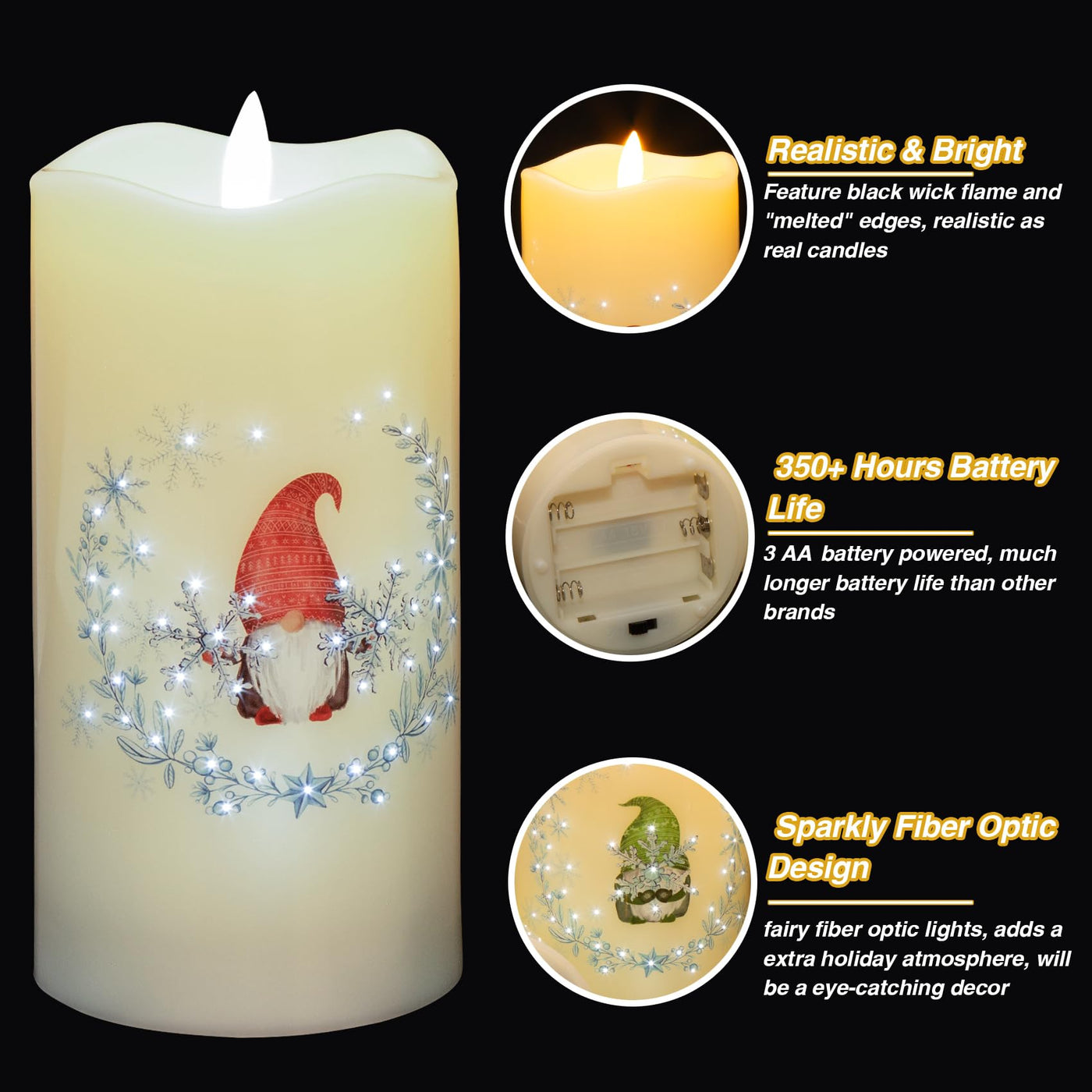 Eywamage Fiber Optic Christmas Flameless Pillar Candles With Remote, Snowflakes Gnomes Flickering Led Battery Candles Set Of 3