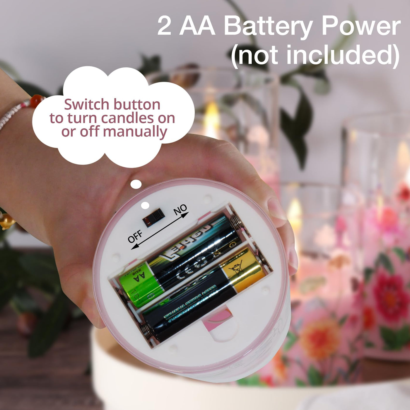 Q: How long do the batteries last in the Eywamage Pink Floral Flameless Candles?A: Each candle requires 2 AA batteries, which are not included, and can last over 350 hours of use, making them a long-lasting and energy-efficient choice. The remote control uses one CR2025 coin battery, which is included.