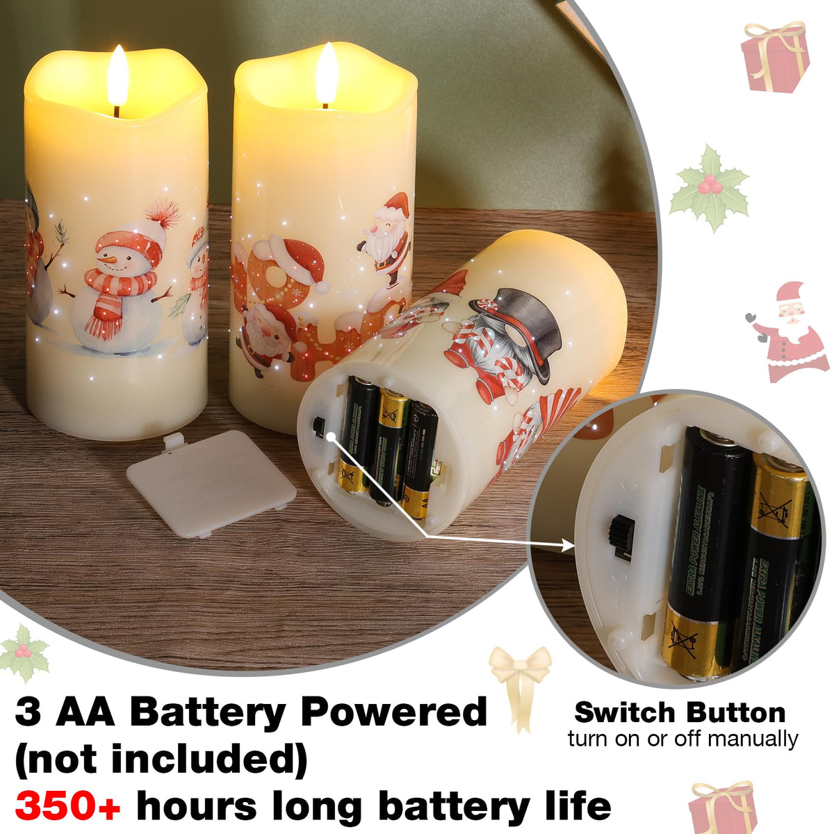 Eywamage Santa Snowman Gnomes Christmas Flameless Candles With Remote, Fiber Optic Battery Led Pillar Candles Set Of 3