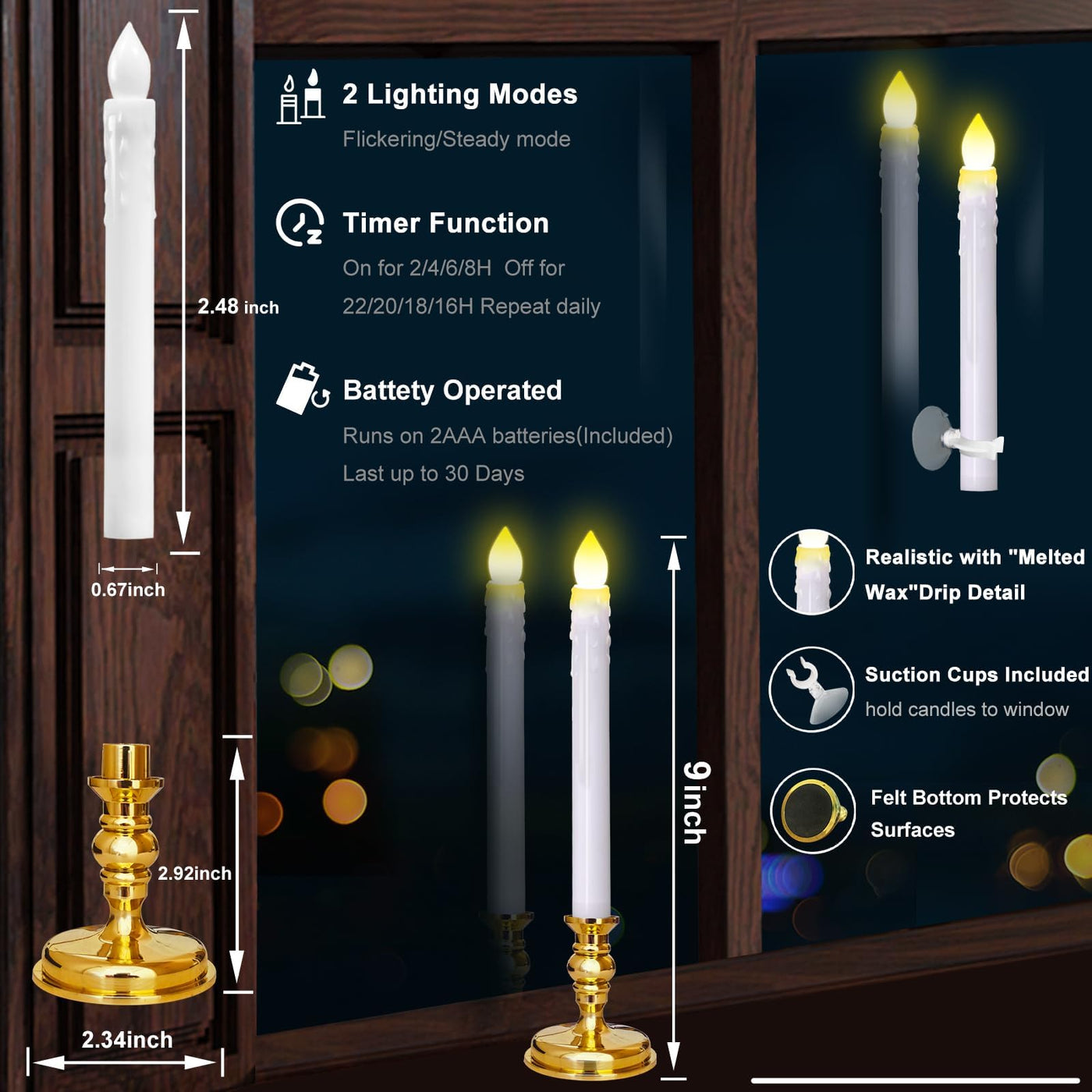 Q: How do Flameless Candles work?A: Flameless Candles operate using battery power, specifically requiring 2 AA batteries per candle. They feature a realistic 3D flame that flickers to mimic the appearance of a real candle, providing a warm glow without any fire hazard.