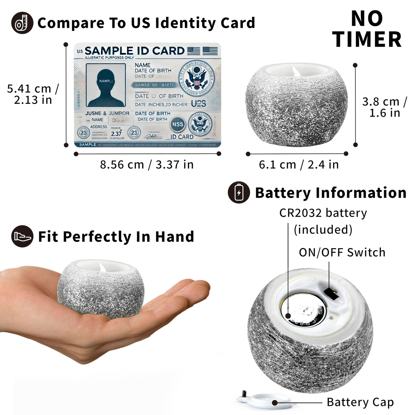 Product Specification Product Name: Furora Lighting Flameless Round Candles, Pack Of 3Material: Real Wax (Paraffin)Color: Black Glitteryled Light Color: Warm Yellowpower Source: Cr2032 Battery Per Candle, Pre-Installedproduct Dimensions: 2.5 In Diameter X 1.6 In Heightswitch Options: Slide Switchspecial Feature: Built-In 6/18 Timer, 6 Hours On Followed With 18 Hours Off, Cycles Every 24 Hours Quality Certification *Ce Verification *Rohs(Restriction Of Hazardous Substances) *Weee(Waste Electrical And Electronic Equipment) *Fcc(Federal Communications Commission) Ideal For: Home Decorations, Living Room Decor, Bedroom Decor, Bathroom Decor, Kitchen Decor, Farmhouse Decor, Office Decor, Fireplace Decor, Mantle Decor, Wall Decor, Wedding Decor, Holiday Decor, Christmas Decor, Fall And Autumn Decor, Thanksgiving Table Decor ?? 100% Safe And Environment-Friendlyfurora Lighting Flickering Flameless Led Candles Are Ready To Use When You Open The Package. No Smoke, No Dripping Wax, Never Worry About Fire Accident, Safe To Use Around Children, Pets And Seniors. Customer Serviceif You Have Any Questions Or Concerns, Please Contact Us Via Contact Seller, And We Will Be More Than Happy To Assist, Reply Within 24 Hours. Thank You For Choosing Us!