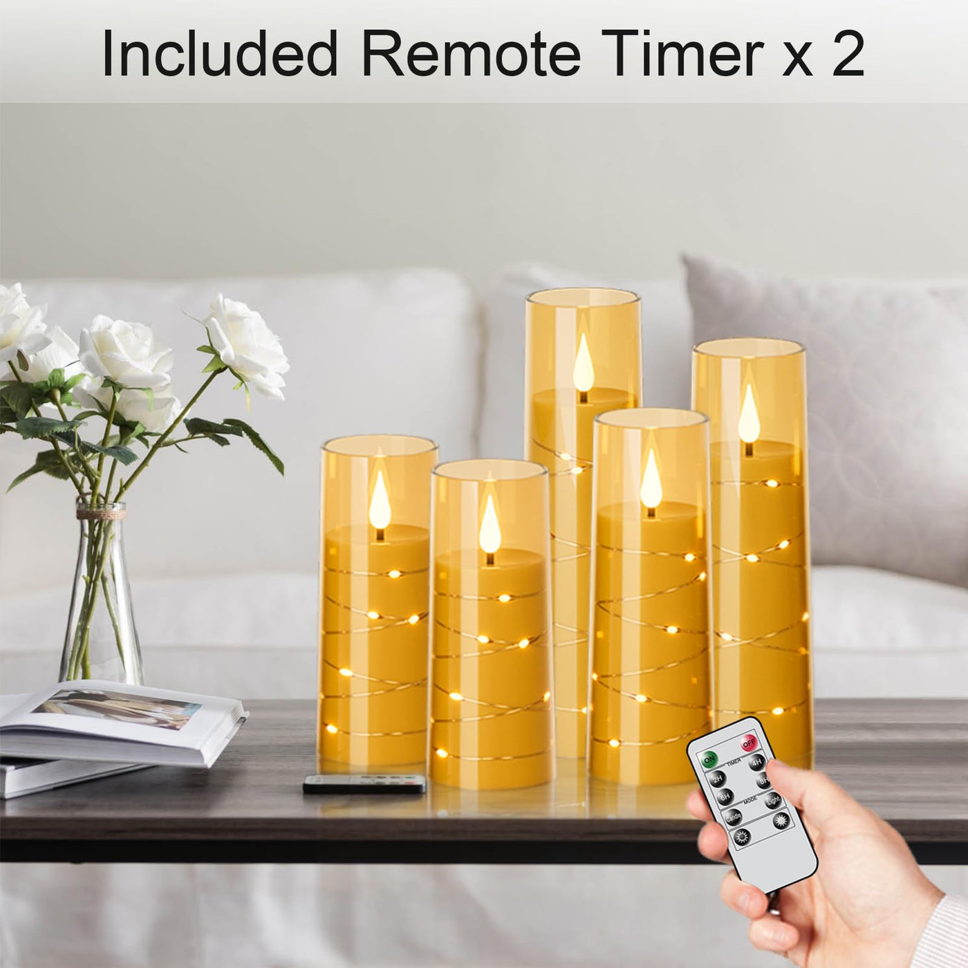 Genswin Flickering Flameless Candles With Remote Timer, 5 Pack Battery Operated Candles With Embedded Star String, Gold Led Batt