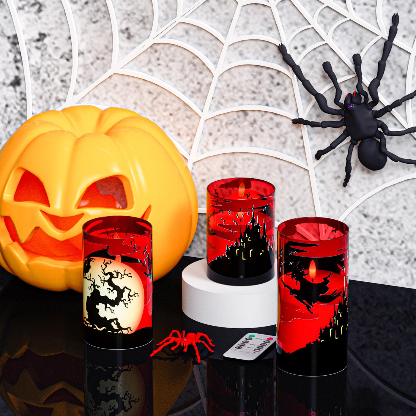 Genswin 3 Pack Flameless Candles With Remote Timer, Led Flickering Candles With Witch, Crow Raven, Castle Decals Candles Battery Operated For Halloween Spooky Indoor Decorations