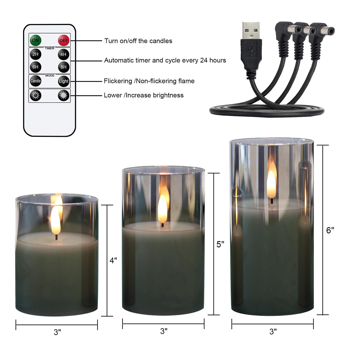 Genswin Rechargeable Led Flameless Flickering Glass Candles With Remote Timer, Battery Operated Pillar Candles Long Lasting Grey Real Wax Usb Candles (D 3Aah 4A5A6A)