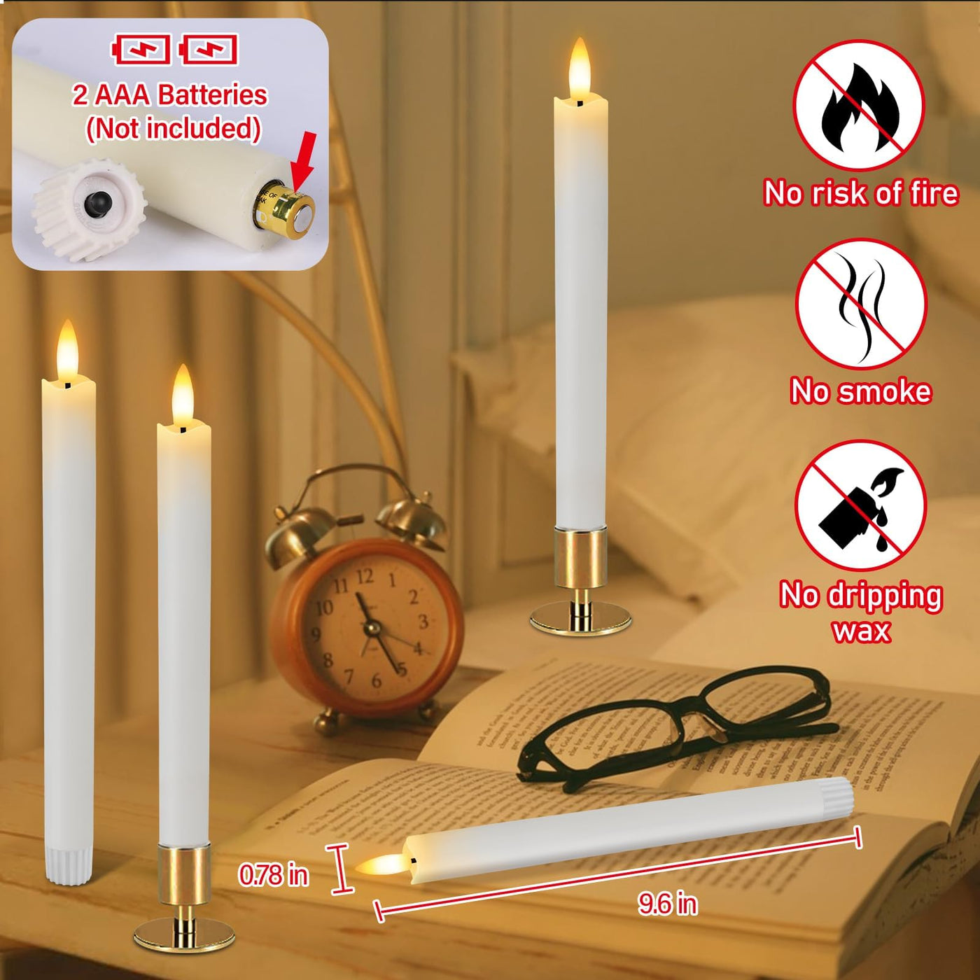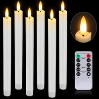 Hinzer Flameless Taper Candles Battery Operated Led Tapered Candles Candlesticks Flickering 9.64 Inch Tall Candles Real Wax Flameless Candles With Remote Packing Includes: 6*Taper Candles Battery Operated 1*10-Keys Remote Control 1*Manual Color: White Material:Real Wax 2 Aaa Battery Operated (Not Included) Perfect Thanksgiving, Halloween, Christmas, New Year Gifts! Realistic Led Candles Flickering With Remote The 3D Wick And Flame Of The Battery Taper Candles Flickering Flame Have Been Carefully Designed To Perfectly Simulate A Real ''Just Lit'' Candle. Bring You The Most Authentic And Warm Experience. Safety First Each Flickering Flameless Candles Emits A Warm White Light With No Real Flame. You Can Use Them Safely Around Fabrics And Furniture. Create The Warm And Inviting Atmosphere Of A Real Candle Without Messy Wax Or Open Flames. Convenient Remote Control & Timer You Don'T Leave Your Cozy Bed To Turn On Or Off These Flameless Candlestick Manually, All Remote Control Candles Are Easily Operated Through The Remote ( On/Off, Bright/Dim, 2/6/4/8 Hours Timer Function). Timer Function Instruction: 6/H: 6 Hours Lights Up, 18 Hours Off, Automatically Turn On At The Same Time On The Next Day. Ideal Ambience Decoration: Tapered Candles Battery Operated Without Any Smells Are Perfect For Every Occasion: Home Decor, Celebrations, Restaurants, Bars, Prom, Churches, Weddings, Appointments, Mantels, And Dining Table. Note: These Flameless Taper Candles Are Made Of Real Wax, Please Keep Them Out Of Direct Sunlight.