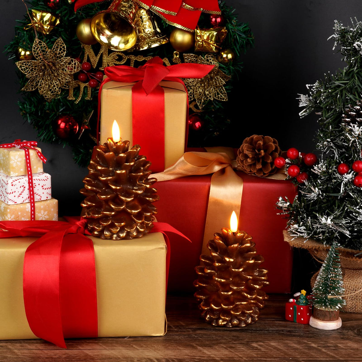 Q: What materials are the Homemory Flameless Pine Cone Candles made from?A: The Homemory Flameless Pine Cone Candles are made of real wax, giving them a lifelike appearance while also featuring decorative pine nut accents adorned with gold glitter.