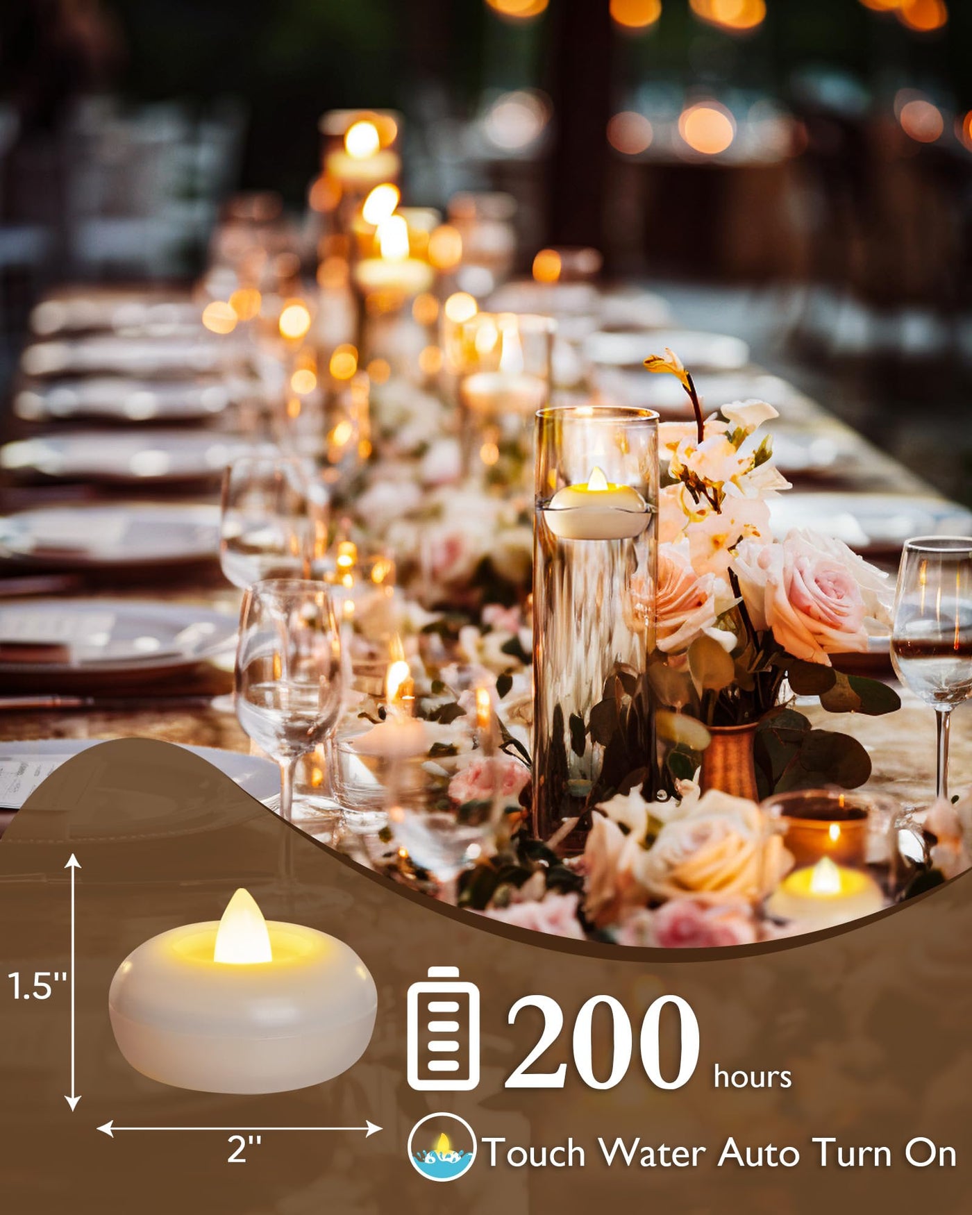 Q: Can these candles be used outdoors for events like weddings or parties?A: Absolutely! The waterproof design of these floating tealight candles makes them perfect for both indoor and outdoor events, including weddings, parties, and poolside decorations, creating a romantic and relaxing ambiance.