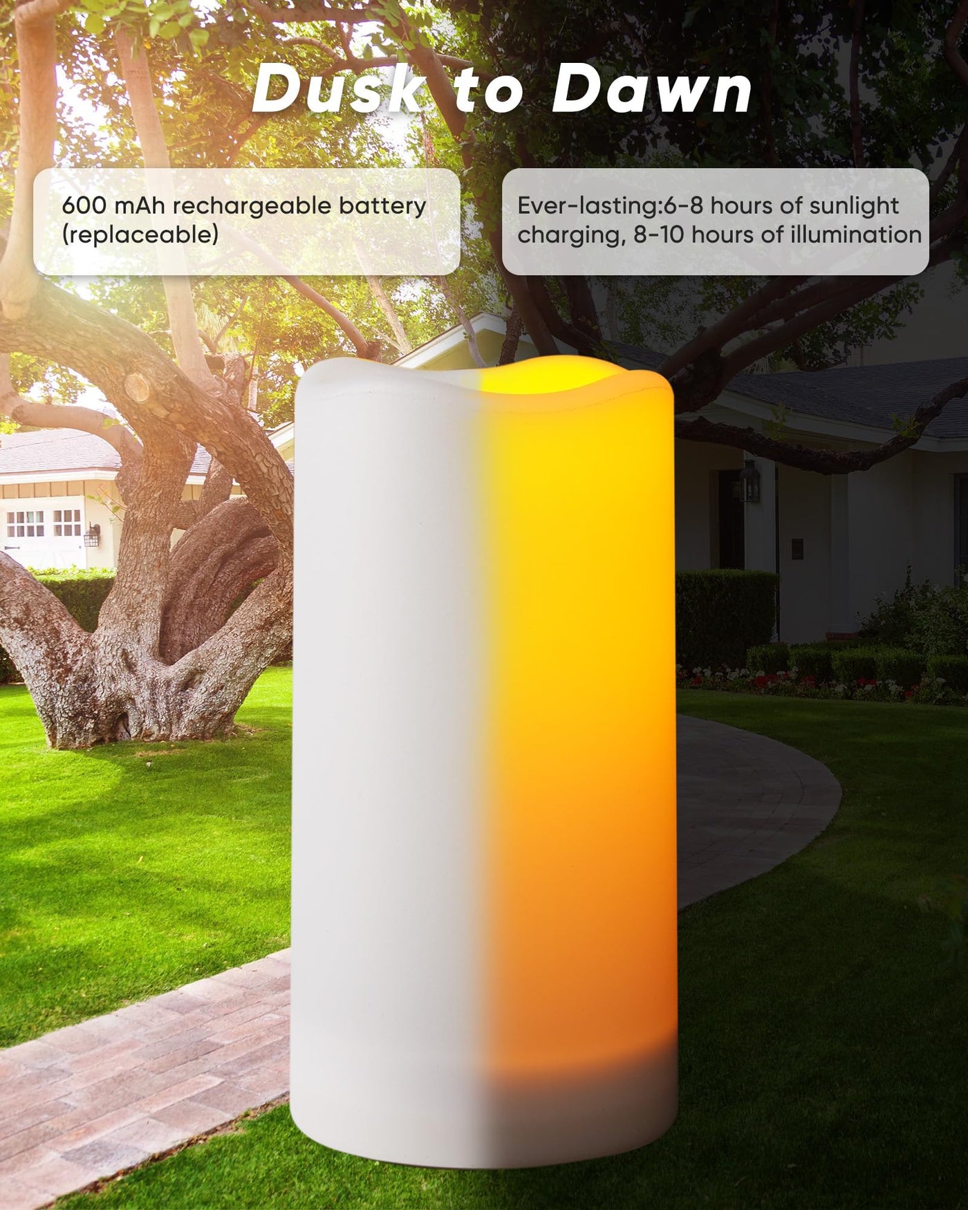Solar Candles Outdoor Waterproof: These Homemory Solar Candles Are Suitable For Outside Use As They Are Waterproof And Won? Melt, Can Withstand The Rain And Sunlight, Also Work Great In Cold Environment. | Dusk To Dawn Flameless Candles: These Candles Have A Built-In Light Sensor, When The Surrounding Environment Is Bright, The Candle Is In The Extinguished State; When The Environment Is Dark, The Light Will Come On; Automatically Turn On And Off, Without Human Operation, Very Convenient. | Solar Powered Candles: These Solar Candles Have A Built-In Solar Charging Panel, As Long As They Are Placed In A Sunny (Unshaded) Place, They Will Charge The Built-In Battery, With The Built-In Light Sensor, Make It Long-Term Cycle Use Without Replacing The Battery. By Placing The Candles In A Sunnier Unobstructed Area And Receiving 10-12 Hours Of Light Per Day, They Will Be Lit Longer And Brighter At Night. | Safe And Reliable Batteries: Each Candle Is Equipped With A 1.2V Ni-Mh Aa Rechargeable Battery With 600 Mah Large Capacity, Which Is Very Safe, Stable And Reliable When Used With Solar Charging Board; Even If The Battery Performance Declines After A Long Period Of Use, It Can Be Easily Replaced By Taking Out The Bottom Cover (Please Do Not Replace It With Ordinary Batteries). | Package Includes: The Packaging Includes 2 Solar Powered Flameless Candles (6