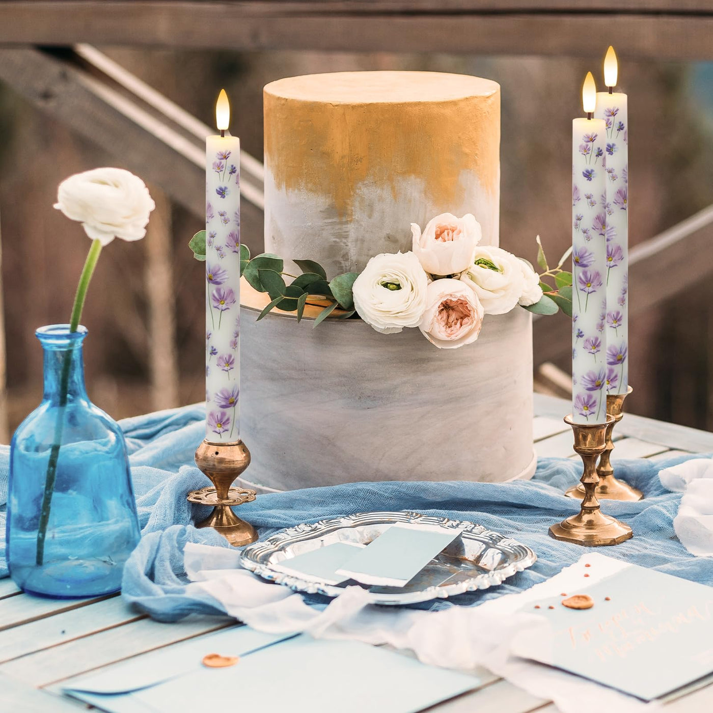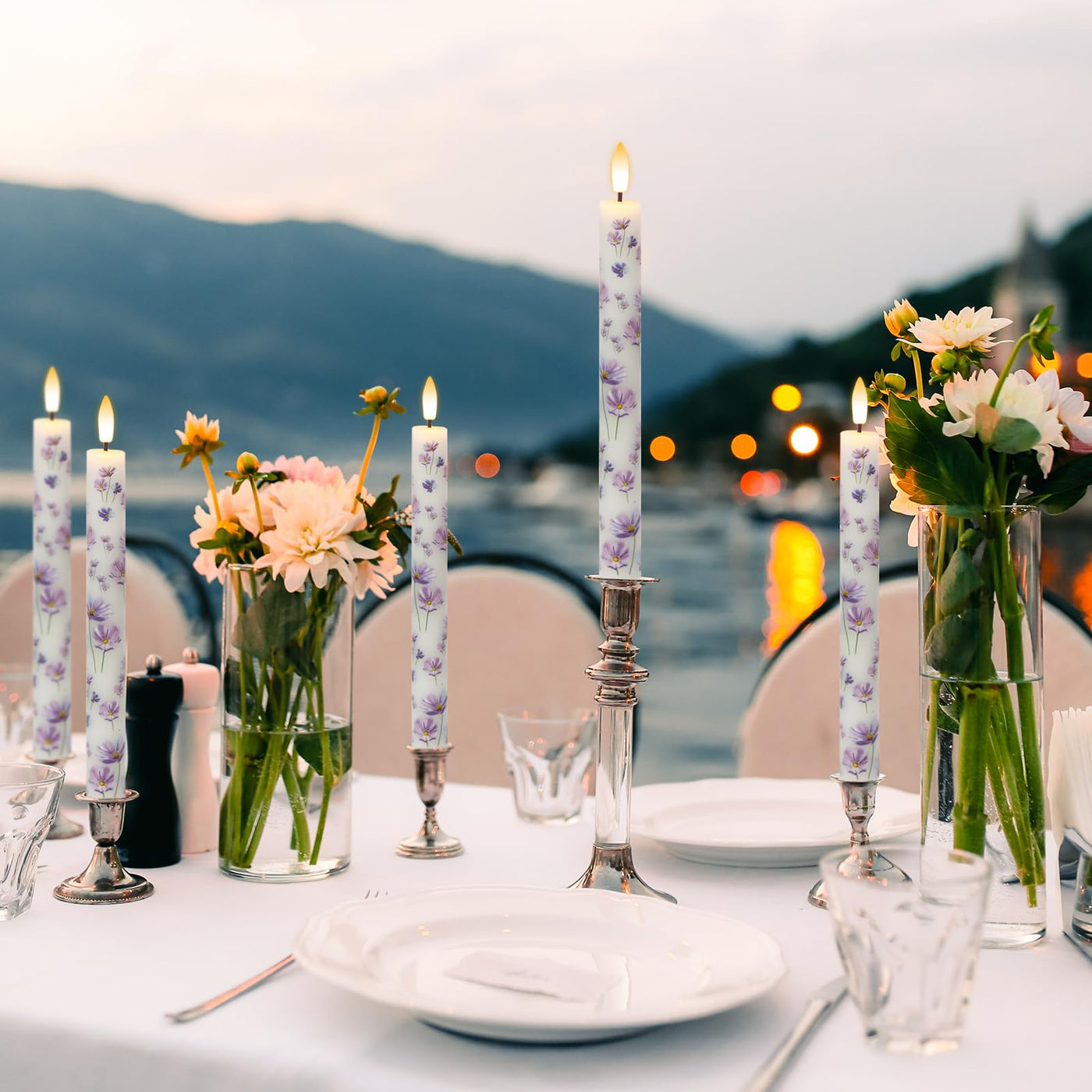 Kunswenn Flameless Taper Candles With Remote Timer, 4 Pcs Spring Flowers Led Taper Candles Battery Operated With Decals,Timer Flameless Candlesticks With Purple Flowers Decals For Valentine'S Day Wedding Home Decor(0.75 X 9.65 )